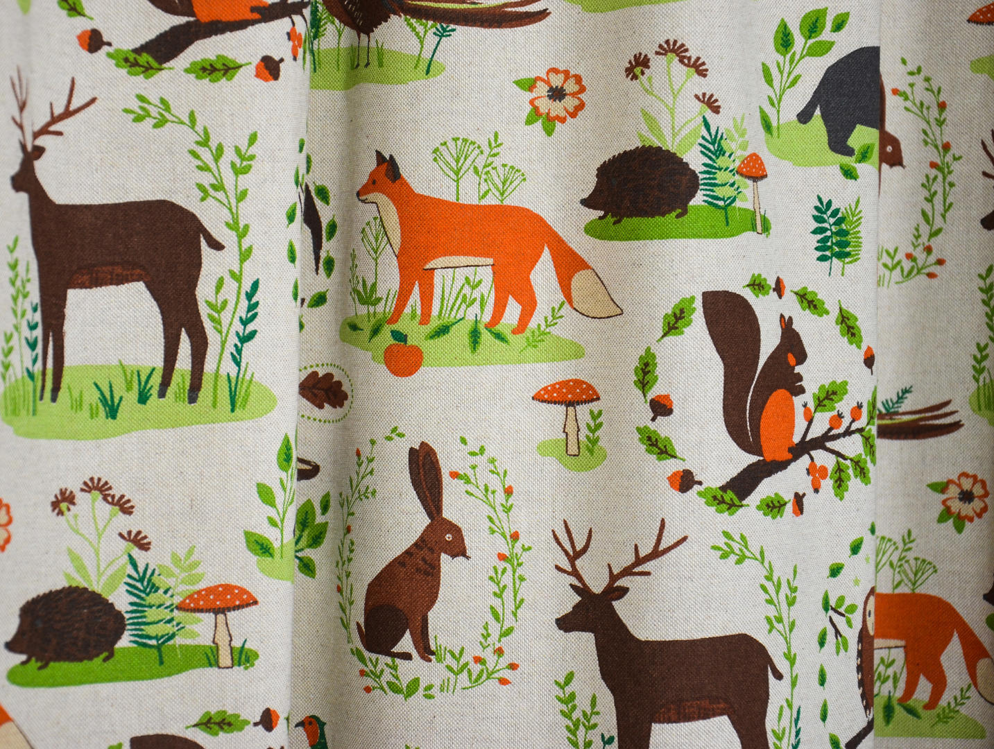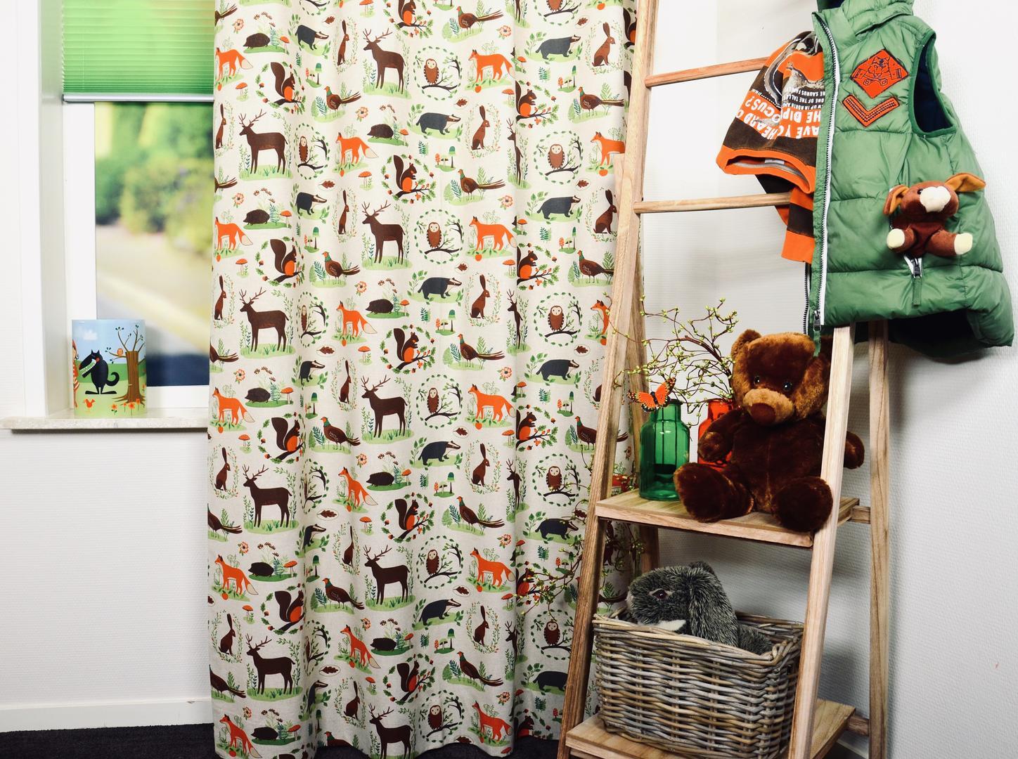 Prachtige linnen kindergordijnen met aandoenlijke illustraties van dieren in het bos. Deze stof is leuk te combineren met de Foxes, Triangle Fox en Forrest Life kindergordijnen. Voor het mooiste effect adviseren wij u om deze stof te laten voeren.