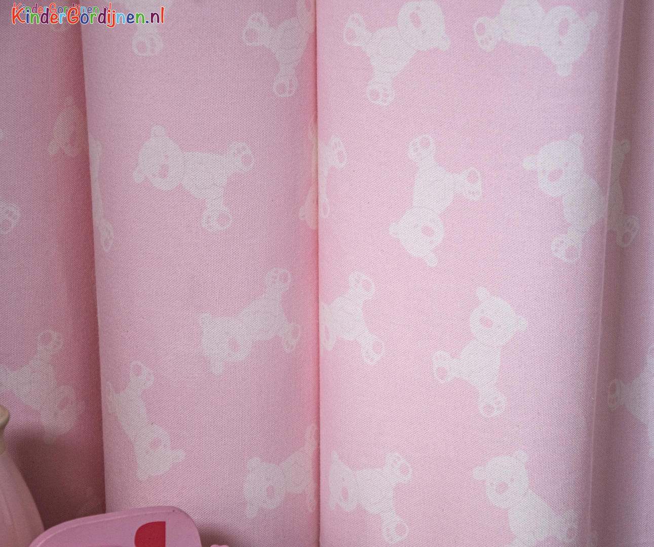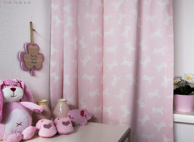 Vrolijk kijk ik de wereld in! Ja ook jij kleine beer! Dit gordijn is schattig voor de kleine van jou, door de kleine, tuimelende troetelbeer. Het 6 cm grote teddy beertje kijkt helder en eigenwijs de slaapkamer in. Door de herhaling van vorm, blijft het gordijn rustig en toch speels. De stof is leverbaar in 3 verschillende kleuren en kamerhoog, waardoor het gordijn zonder naden stijlvol tot de grond gemaakt kan worden. Voor verduistering desgewenst voeren.