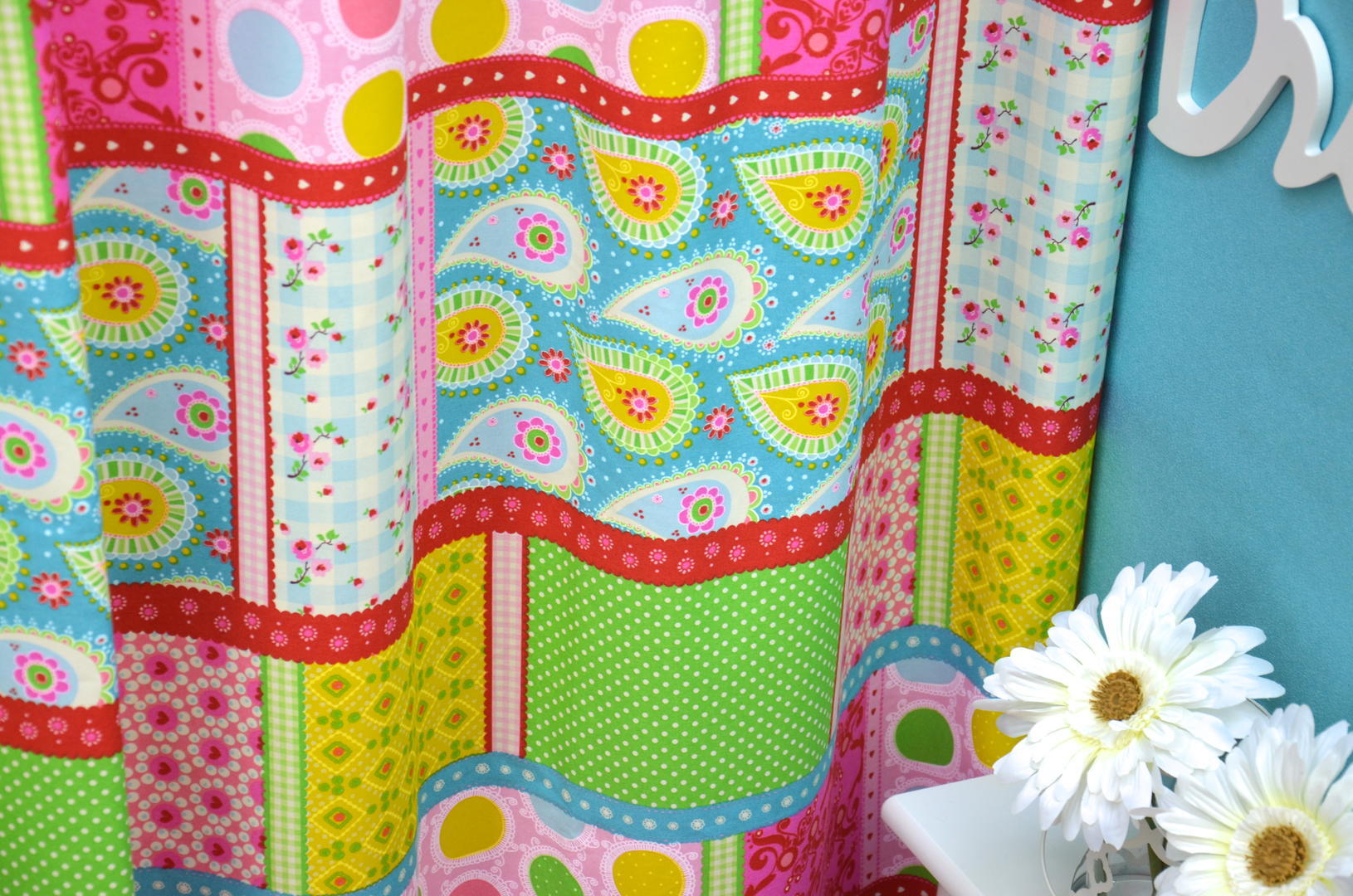 Verschillende gewaagde kleuren, dessins en vormen maakt dit patchwork gordijn uniek. Versier de kinderkamer met deze bonte gordijnen en uw kinderen vervelen zich nooit meer!