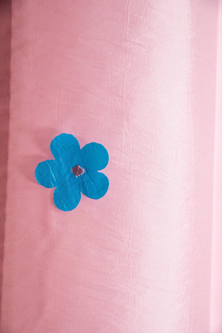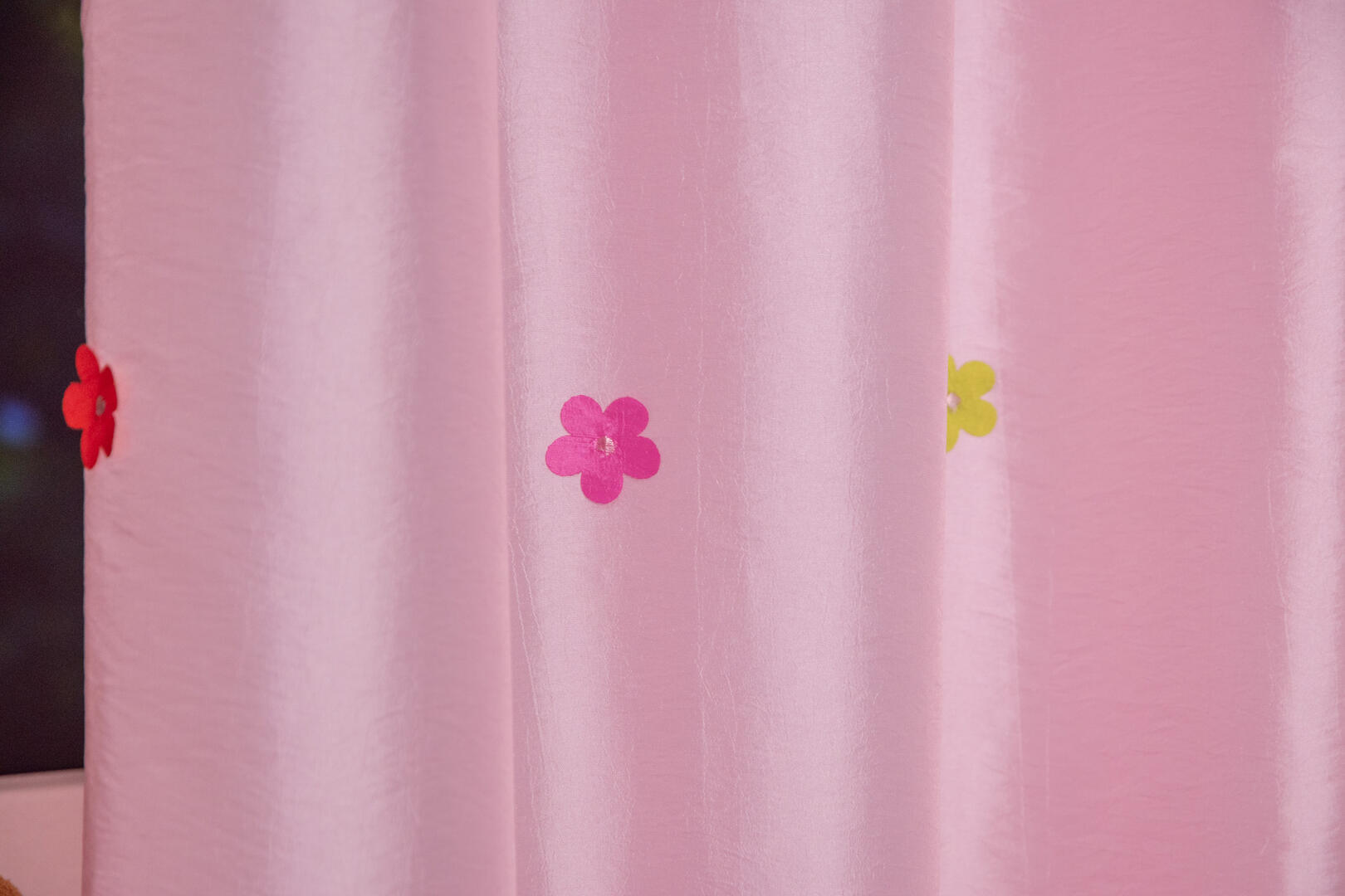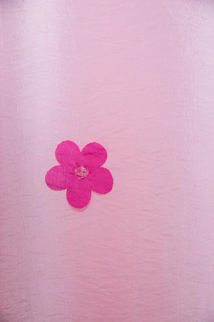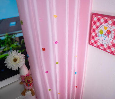 Wil je iets unieks? Kijk dan eens naar deze duurzame zacht roze gordijnstof, het is alsof de opgestikte 3d bloempjes zojuist zijn uitgekomen!