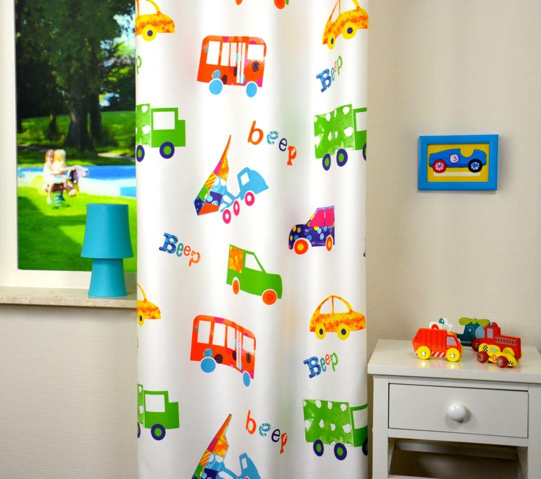 Uw zoontje gaat toeterend naar dromenland met dit drukke verkeer op de gordijnen.