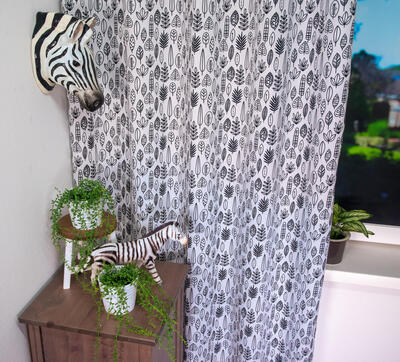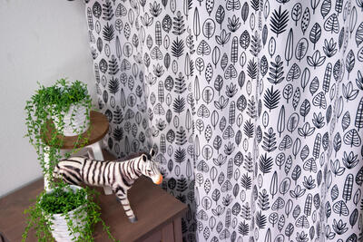 Hoe leuk is dit! zelf met textielstiften je eigen gordijn inkleuren. De bladeren zijn ± 10cm groot. Hoeveel bladeren kleur jij op dit bijzondere kindergordijn?