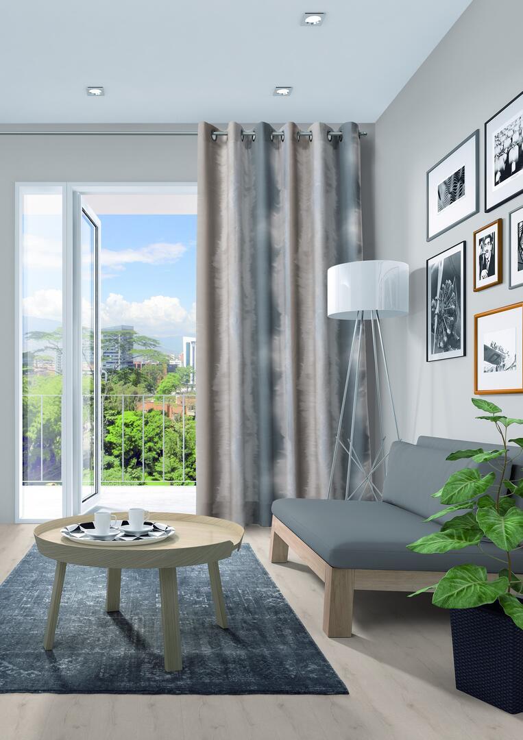 De gordijnstof van "Stone" komt het beste tot zijn recht met een vlinderplooi of met stoere zeilringen, zoals te zien is op de sfeerfoto. Hiermee voeg je een extra dimensie van stijl en karakter toe aan je gordijnen.