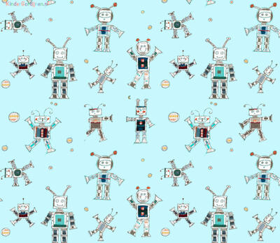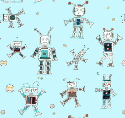 Bliep bliep! Vriendelijke handgetekende robots dansen over dit gordijn. Het ontwerp van dit gordijn is gemaakt door Hanneke de Jager. Voor verduistering even laten voeren.