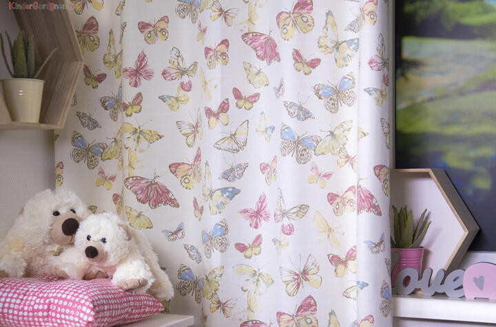 Vrolijke vlinders fleuren je kamer op! De afbeeldingen zijn gedrukt op een matte, ietwat geruwde katoenen stof en dat geeft een sportief effect. De vlinders zijn gemiddeld 9 cm groot en nonchalant verdeeld over de stof. Dit sluit helemaal aan bij de actuele woontrend: we koesteren de natuur en buiten mogen we binnen laten zien. De basisstof is warmwit en lichtdoorlatend. Het gordijn kan heel goed gecombineerd worden met een vrolijk gekleurde accentwand. Ga jij voor zo’n mooie vlinder in je kamer?