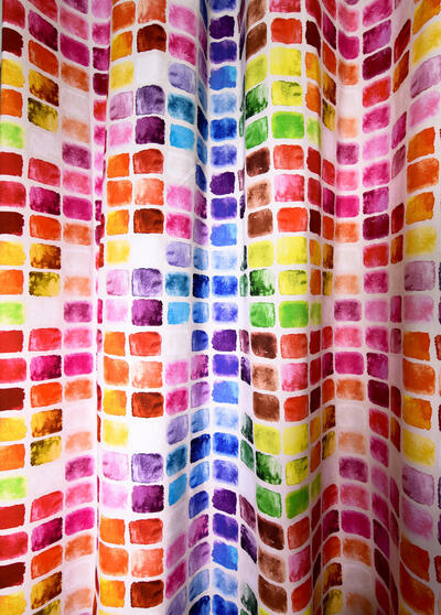 De aquarel blokjes, met een afmeting van 4,5 x 4,5 cm, zijn gedrukt op een matte, warm witte stof. De geschilderde techniek en het regenboog-achtige verloop zorgen voor een subtiel en toch levendig effect. Dit betekent dat het gordijn een opvallende aanwezigheid heeft, maar niet overweldigend druk is.