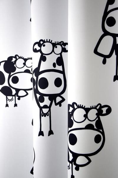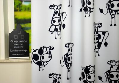 Dat geldt zeker ook voor deze gordijnstof met de naam Koe! (verduisterend), een unieke gordijnstof met een dessin.