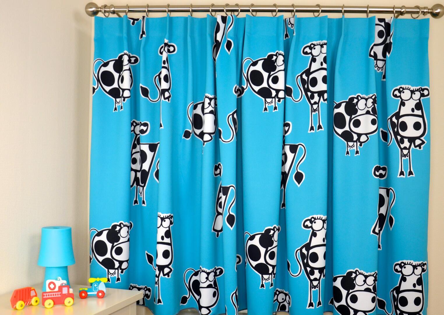 Deze gordijnstof met de naam Koe! (verduisterend) is gemaakt van de beste materialen waardoor het gordijn mooi in de plooi valt.