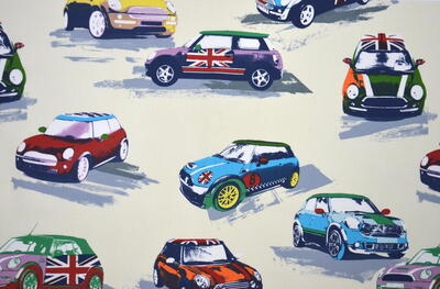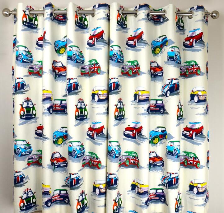 Katoenen overgordijn met Mini Cooper auto’s in de kleuren rood en blauw. Dit gordijn mag niet ontbreken in de kinderkamer van jonge autofanaten.