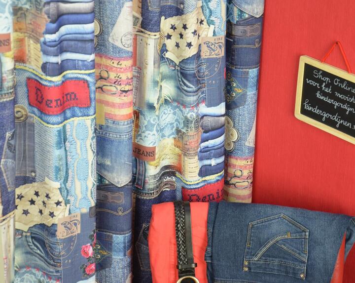 Een spijkerbroek staat niet alleen leuk om je middel maar ook in de slaapkamer. Dit gordijn mag niet ontbreken in de kinderkamer van jonge modeliefhebbers! Kleurrijke gordijnstof met allerlei verschillende spijkerbroeken.