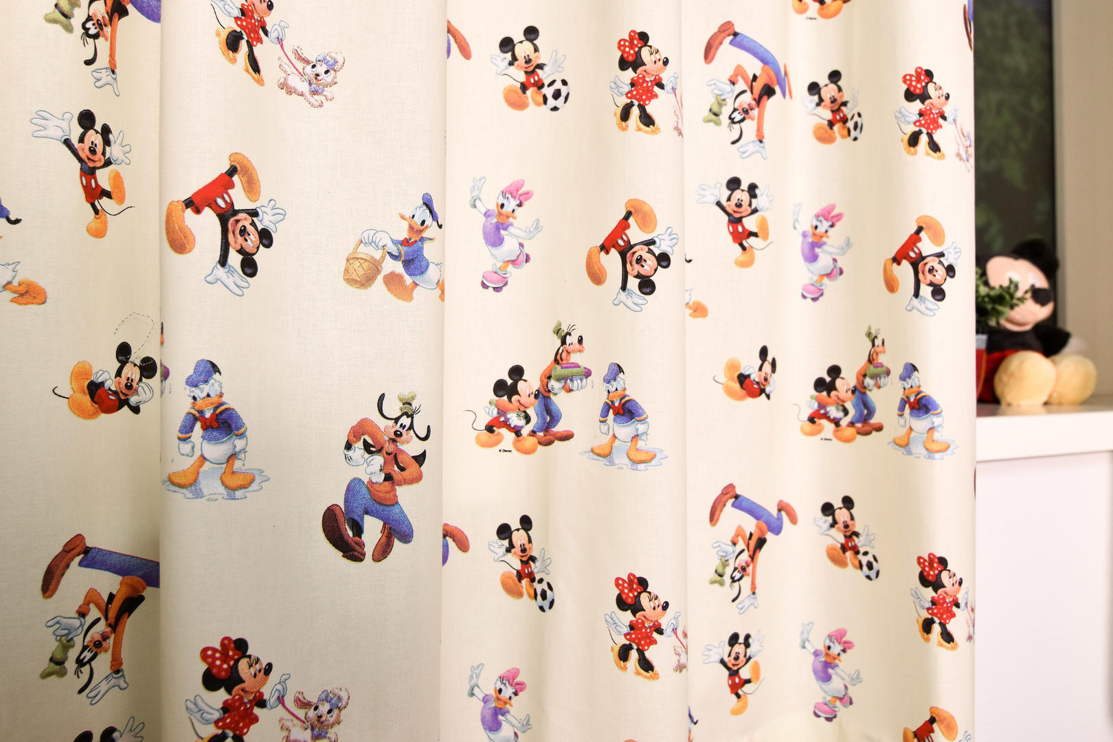 Echte Disney gordijnen, met Mickey en Minnie Mouse en natuurlijk vriend Goofy. Die stuitert hier vrolijk ondersteboven over het gordijn, “Gompy”. Donald en Katrien Duck dansen vrolijk mee. Katrien even charmant als altijd. De stof is mat en heel fijn geweven. De ondergrondkleur is heel zacht vanillegeel, wat voor een extra zonnig effect zorgt. Deze Disney figuren ken je vast van het weekblad Donald Duck of Mickey Mouse clubhuis op TV. Sinds 1934 is Donald de lieveling van jong & oud. Met dit gordijn heb je al die Duckstad vriendjes op je kamer!
