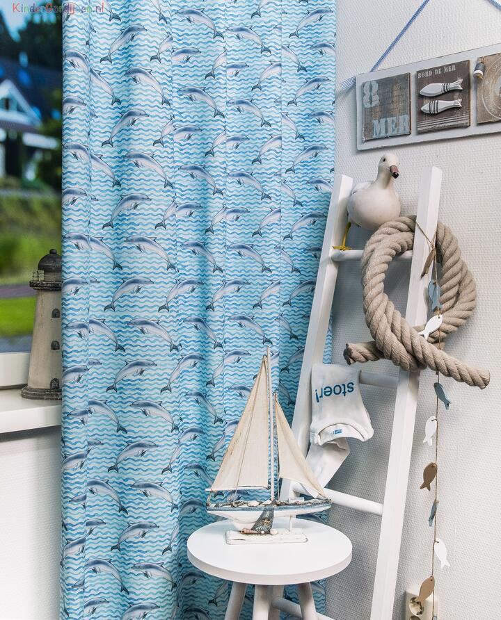 Deze gordijnstof met de naam Diving Dolphins is gemaakt van de beste materialen waardoor het gordijn mooi in de plooi valt.