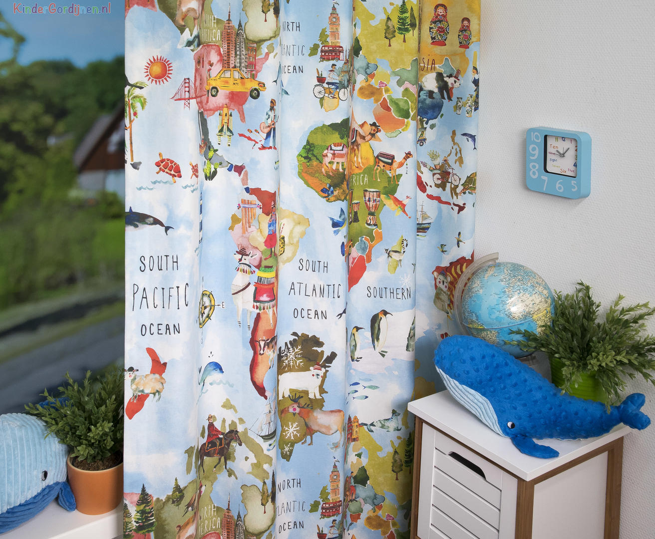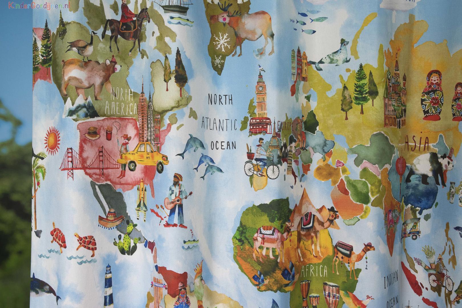 Met dit speelse gordijn kan uw kind de hele wereld over reizen. Op elk werelddeel staan leuke animaties over de dieren, planten en gebouwen die uw kind hier kan tegenkomen.