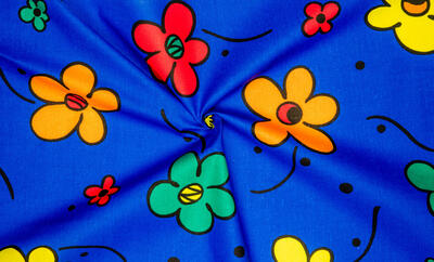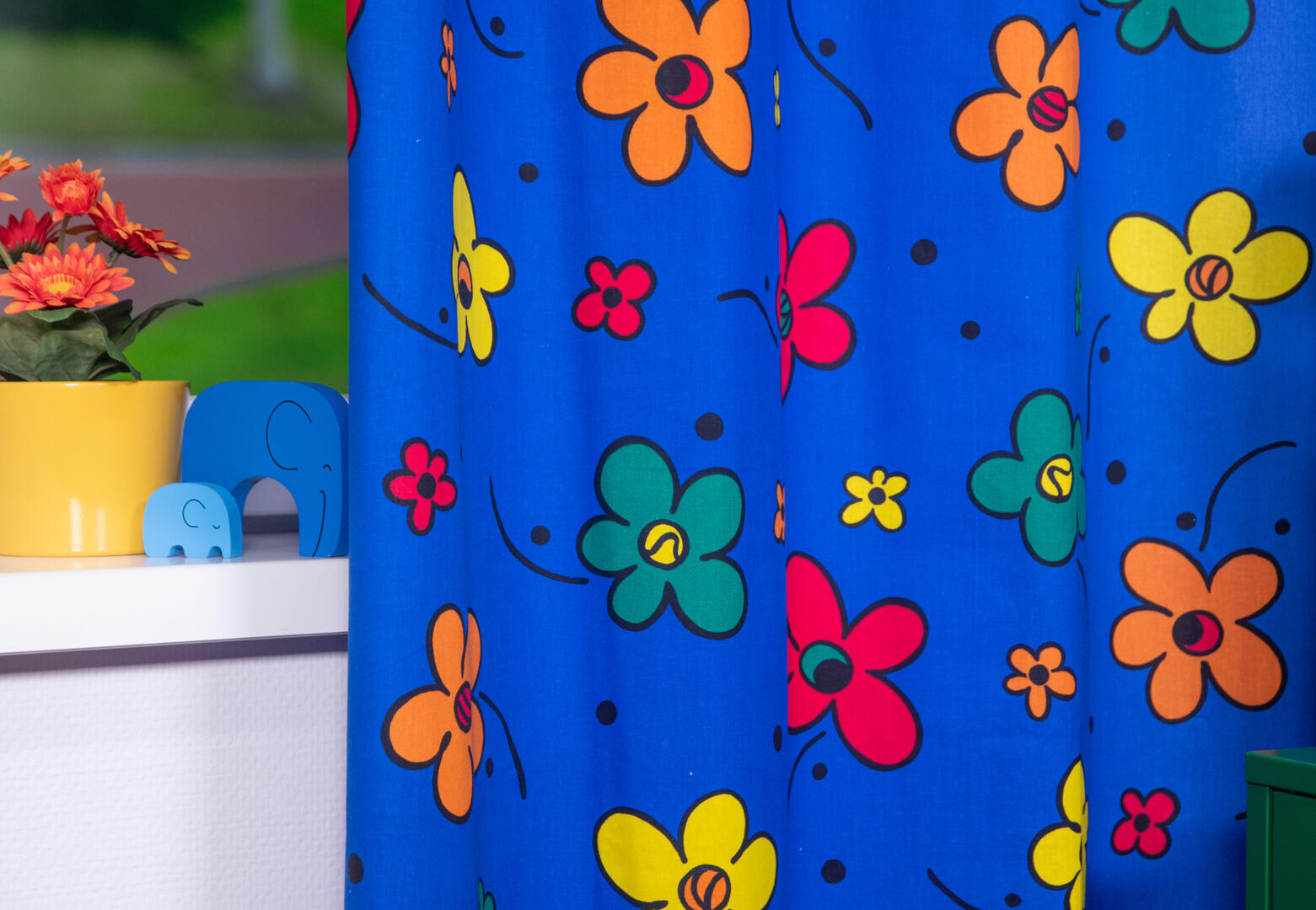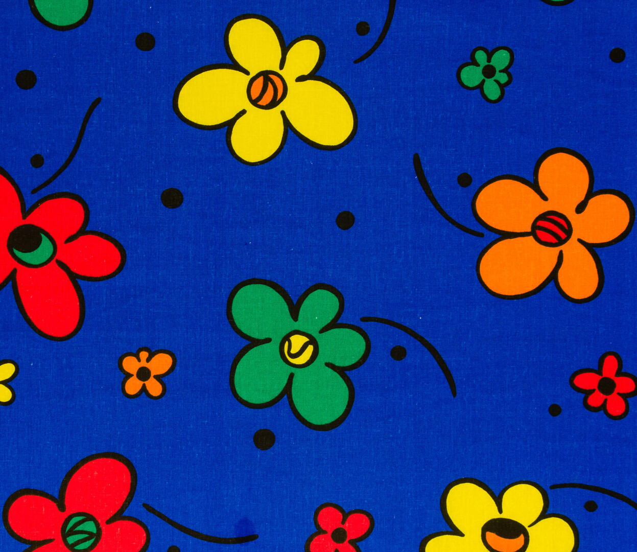 Deze bijzonder populaire gordijnstof heeft grote vrolijke gekleurde bloemen op een donkerblauwe achtergrond.