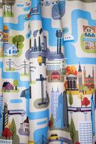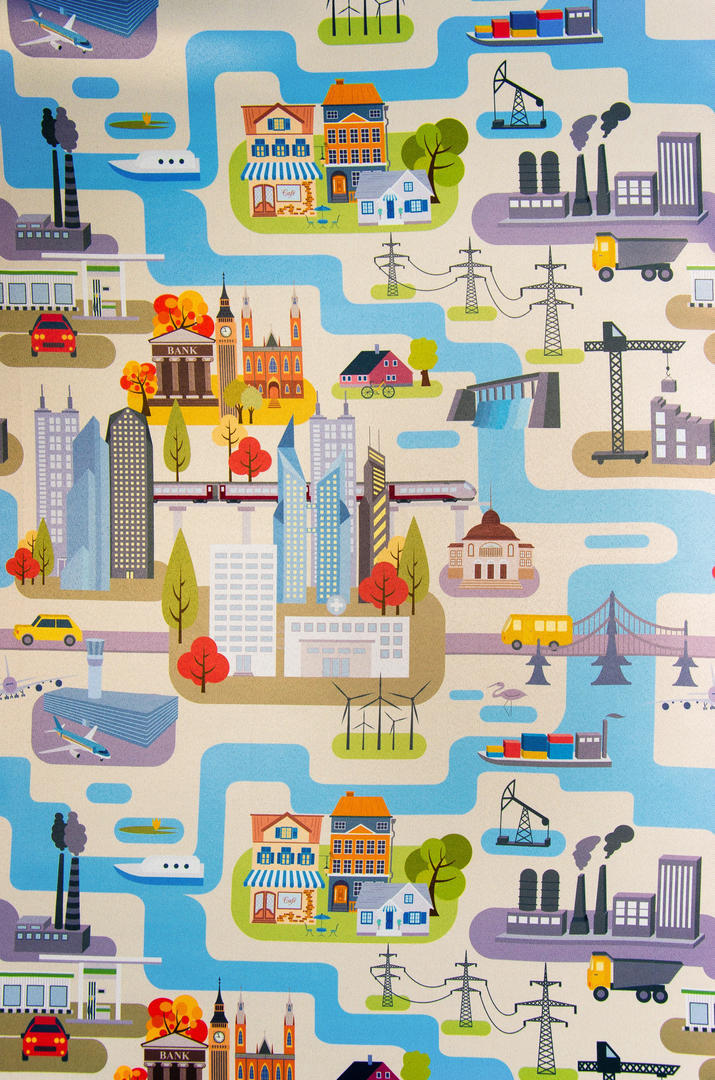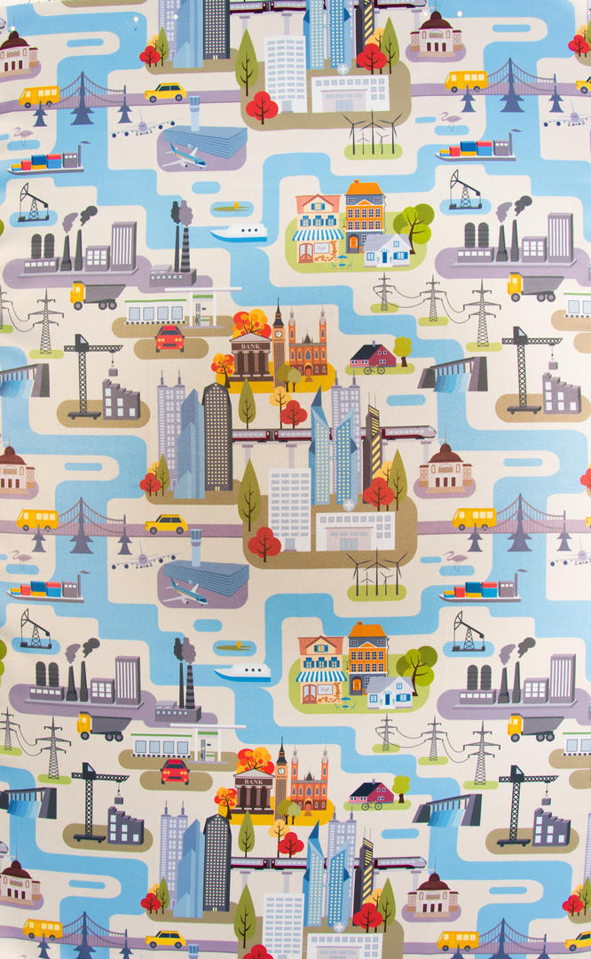 Dat geeft een ruimtelijk effect! Een eindeloze rivier afgebeeld op je gordijn. Langs de oude stad naar de boerderij en het verder gelegen windmolenpark. De boot brengt je langs alle landschapselementen, van vliegveld tot fabriek. Zo kan jij je eigen fantasieverhaal maken, iedere keer een ander reisje. Wat dit gordijn extra speciaal maakt is zijn dim out effect. Dat betekent dat zonder extra voering de slaapkamer lekker donker wordt. De stof valt soepel en is aan de achterzijde egaal gebroken wit van kleur. De ‘jaknikker’ is b.v. 5 cm groot en gedrukt op de matte, zachtgrijze stof. Reis jij mee door de stad?