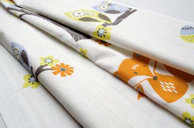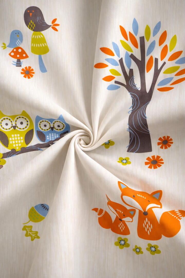 Het gordijn Forest van Esprit is een vrolijk en verhalend dessin dat kinderen elke dag opnieuw meeneemt in een eigen boswereld. In het motief zie je bomen met gekleurde bladeren, nieuwsgierige uiltjes op takken, speelse vosjes, paddenstoelen, bloemen en kleine vogeltjes. Alles is verspreid over een lichte ondergrond met een subtiele verticale structuur in de stof, waardoor het dessin niet druk oogt maar juist rustig en prettig blijft in een kinderkamer.