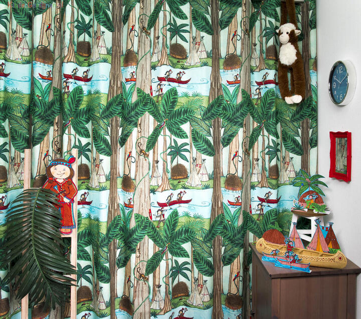 Op ontdekkingsreis in de jungle! Voor zowel jongens als meisjes is een slaapkamer met safari of jungle thema populair. Wilde dieren, bamboe, oerwoud, tipi's, lianen, aapjes, exotische vogels en indianen. Met deze gordijnen in de kinderkamer is het alsof je zo de jungle in stapt.