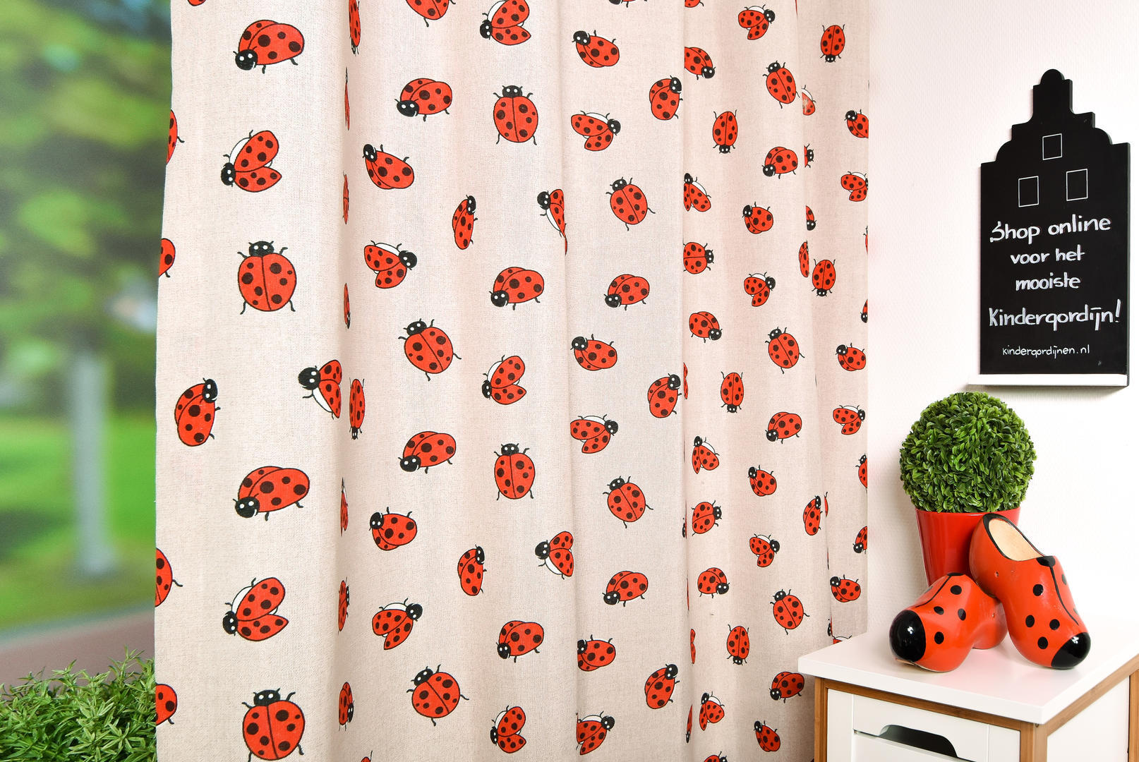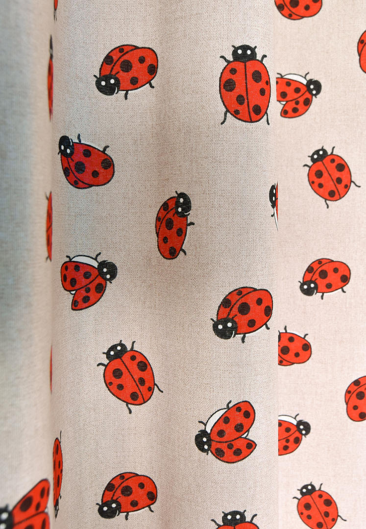 LIEF, LIEF, LIEVE beestje, Oeps, lieveheersbeestje! Schattig toch om daar een gordijn van te hebben?! De lieveheersbeestjes zijn gedrukt op kamerhoge, stevige stof en zijn zo'n 5 cm groot. Licht geribd van structuur en daardoor een vlotte uitstraling. De ondergrond is warm grijs en daardoor makkelijk te combineren met andere kleuren. Klei en leem tinten, samen met sloophout is hierbij altijd perfect! Mogen deze lieve diertjes bij jou komen wonen?