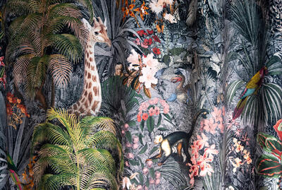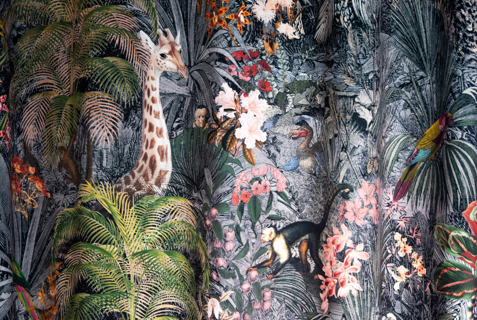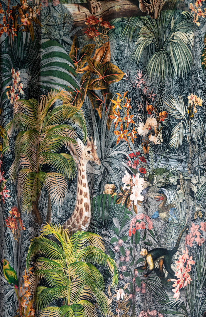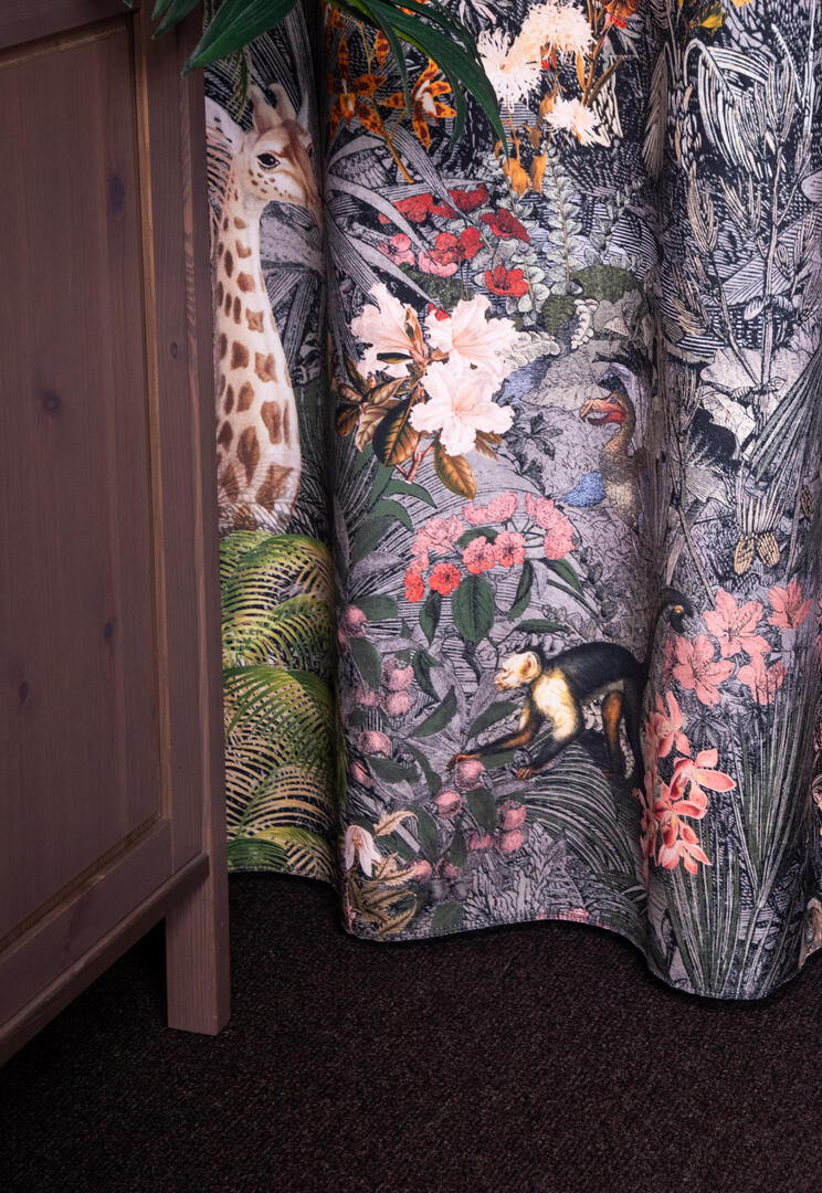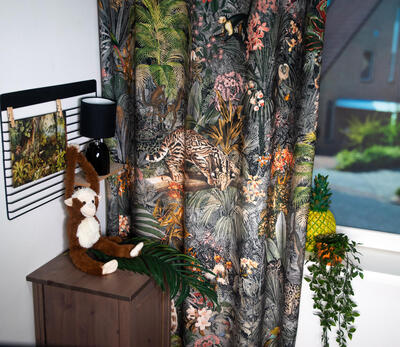 Stap binnen in de betoverende wereld van het kindergordijn Leopards! Op dit zachte velvet gordijn komen giraffes, luipaarden, slingeraapjes, papagaaien en nog veel meer dieren tot leven, verstopt in een weelderige jungle. Kun jij ze allemaal vinden? Dankzij de digitale bedrukking zijn de afbeeldingen haarscherp en levensecht.