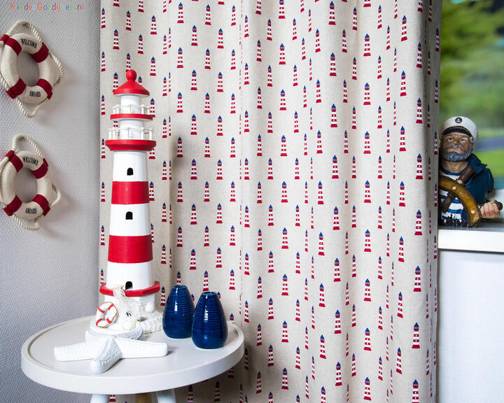 Een prachtig gordijn voor je raam! Als jij je eigen gordijnen kiest, wordt het helemaal jouw kamer. Deze gordijnstof met de naam Lightouses is gemaakt van de beste materialen waardoor het gordijn mooi in de plooi valt. Het aantal te gebruiken banen gordijnstof van 140 cm breed wordt door ons vakkundig aan elkaar geconfectioneerd zodat het maritiem patroon van 16 cm mooi doorloopt. Laat voor een aangename isolatie en extra verduistering de gordijnen voeren: een verschil van dag en nacht!