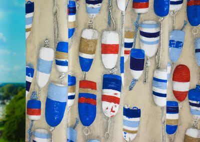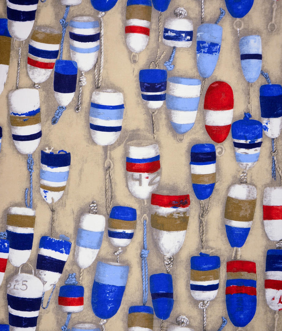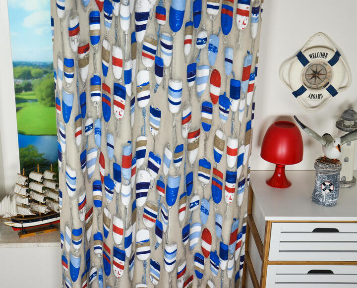 Gewéldige gordijnen voor de watersport liefhebber! De stof is aan de voorzijde bedrukt met drijvers of boeien; officieel ‘stootwill’ genaamd. De stootwil is hier zo’n 12 cm groot. De kleuren zijn toepasselijk in navy stijl gekozen. Het thema kan je uitbreiden met jacht- of zeilboot accessoires of andere strandartikelen. Voor verduistering even laten voeren.