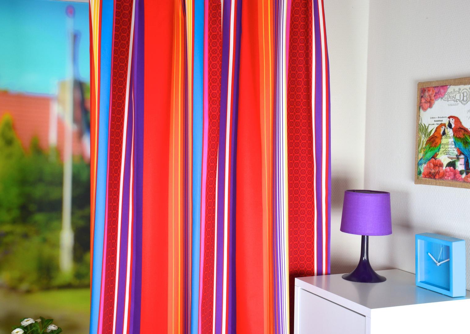 Het kindergordijn Mirte is een levendig en speels gordijn met een frisse streepprint in verschillende kleuren zoals rood, paars, oranje en blauw, waarbij de warme roodachtige tinten de overhand hebben. De toevoeging van fijne honingraatmotiefjes tussen de verticale strepen maakt dit gordijn uniek en geeft het een moderne uitstraling. Gemaakt van soepel vallende satijnen gordijnstof met een tijdloos dessin, is dit gordijn geschikt voor kinderen van alle leeftijden.