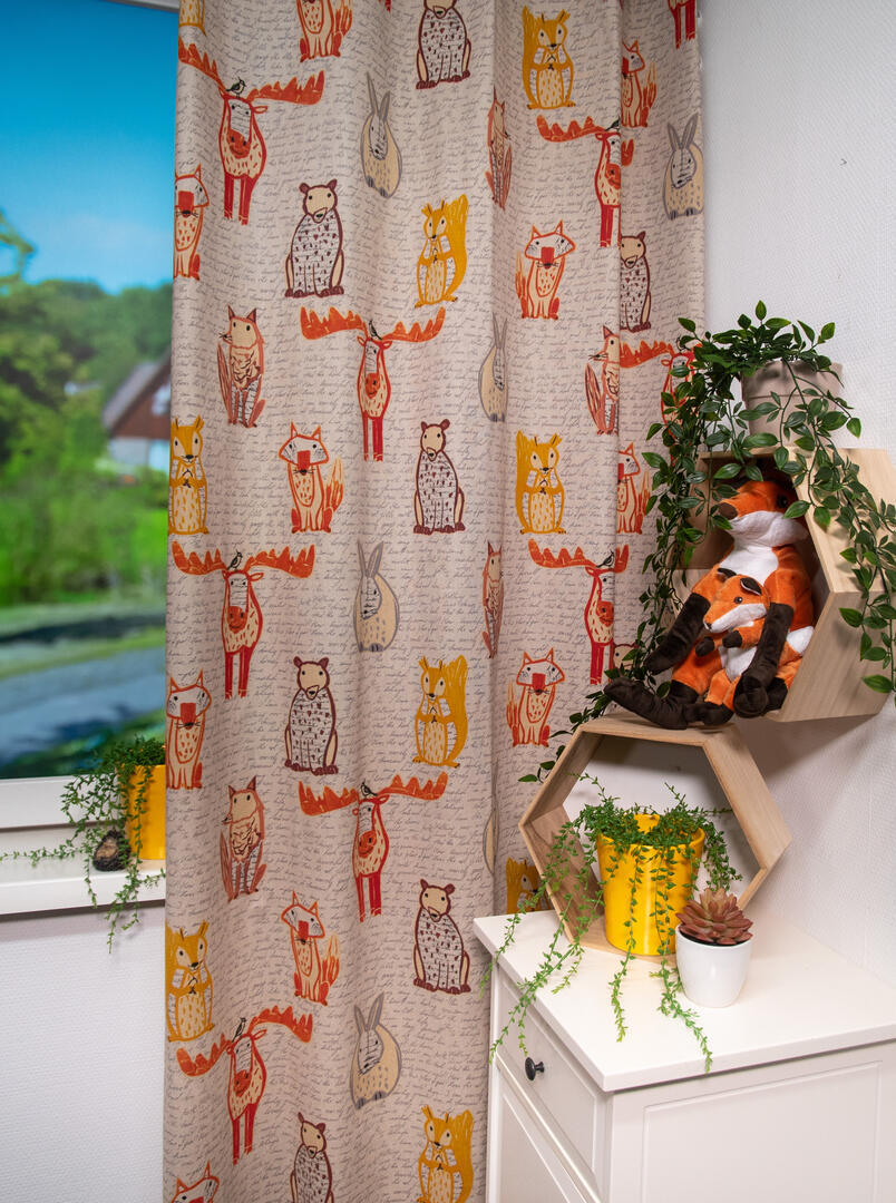 Deze gordijnstof met de naam Moose and friends is gemaakt van de beste materialen waardoor het gordijn mooi in de plooi valt.