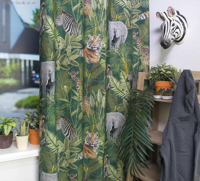 De Moremi is een speels en levendig gordijn dat de kamer vult met de avontuurlijke sfeer van de Afrikaanse savanne. De diepgroene achtergrond vormt het decor voor een prachtig tafereel van wilde dieren die tussen weelderige bladeren en tropische planten tot leven lijken te komen. Op de stof zijn onder andere zebra’s, giraffen, olifanten, tijgers, leeuwen en nieuwsgierige aapjes te zien, allemaal zorgvuldig afgebeeld tussen botanische vormen in verschillende tinten groen, zachtgeel en bruin. De stof voelt soepel aan en valt mooi in de plooi, ideaal voor een kinderkamer waarin gezelligheid en fantasie centraal staan. Dankzij de rijke kleurencombinatie en het gedetailleerde dessin is dit gordijn niet alleen praktisch, maar ook een echte blikvanger aan het raam. De Moremi-gordijnstof is ruim op voorraad, waardoor een snelle en zorgvuldige levering mogelijk is. Tijdens het bestelproces kan worden gekozen voor een voering.