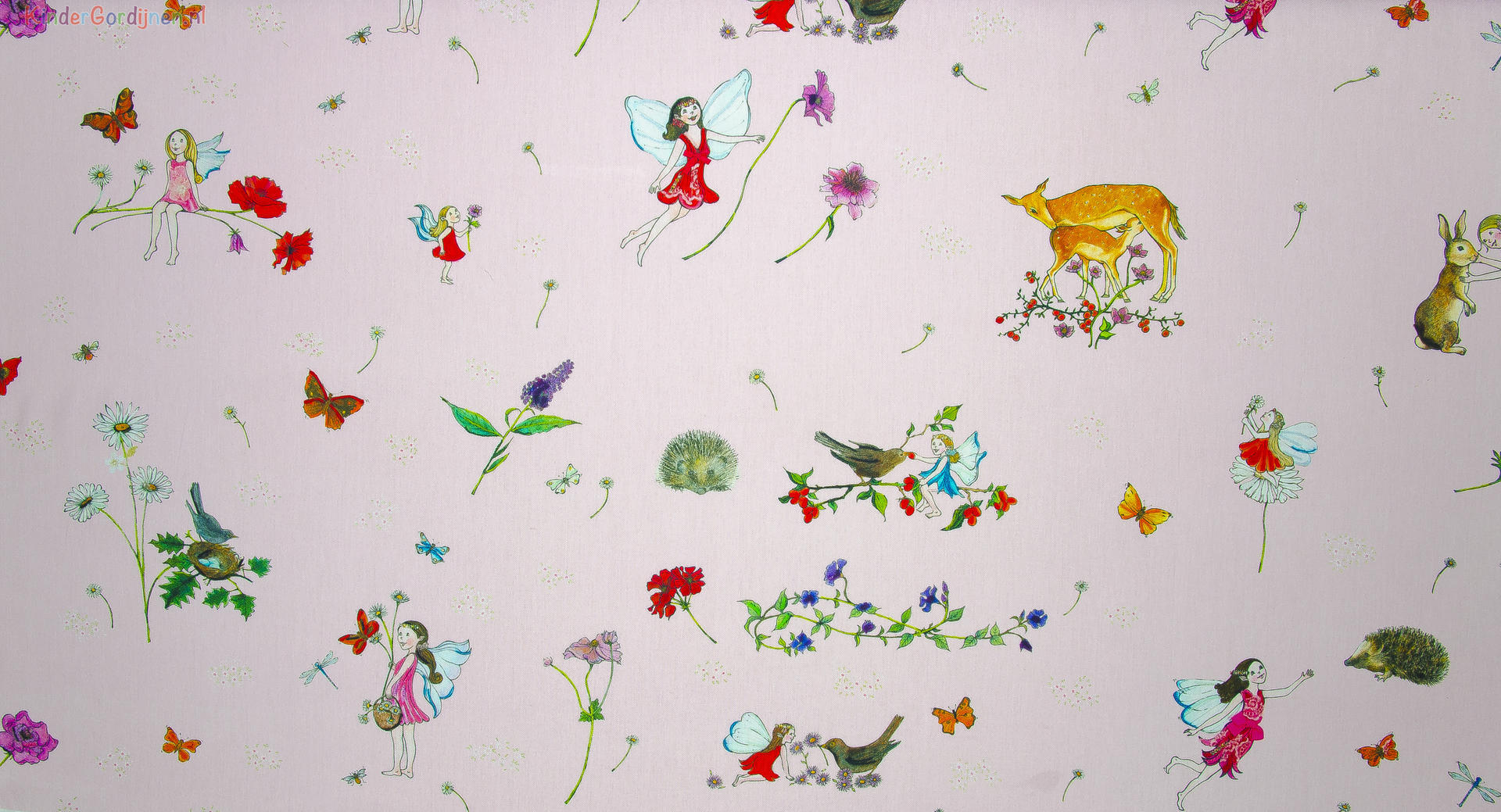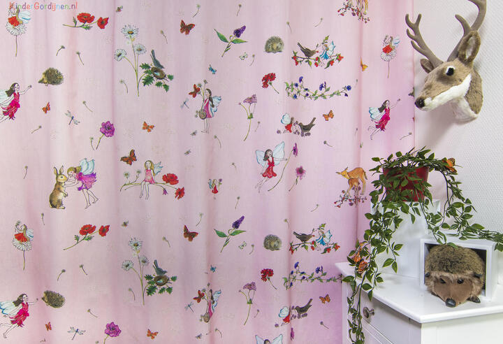 Een súper schattig meisjesgordijn voor de kinderkamer, ontworpen door Hanneke de Jager. Deze beeldend kunstenares is schrijver en tevens illustrator van een aantal bijzonder leuke kinderboeken. Zij omschrijft haar stijl als: fris, kleurrijk, levendig, speels en zonnig. Door gebruik van verschillende materialen zoals stofjes van de markt, knopen en gebreide truien, geeft zij haar illustraties iets unieks. In het patroon zie je namelijk de weergave van die leuke details van de verschillende texturen. Zo zit het vlindermeisje op een haast levensechte roos omringt door allemaal lieve dierenvrienden.