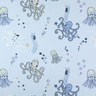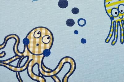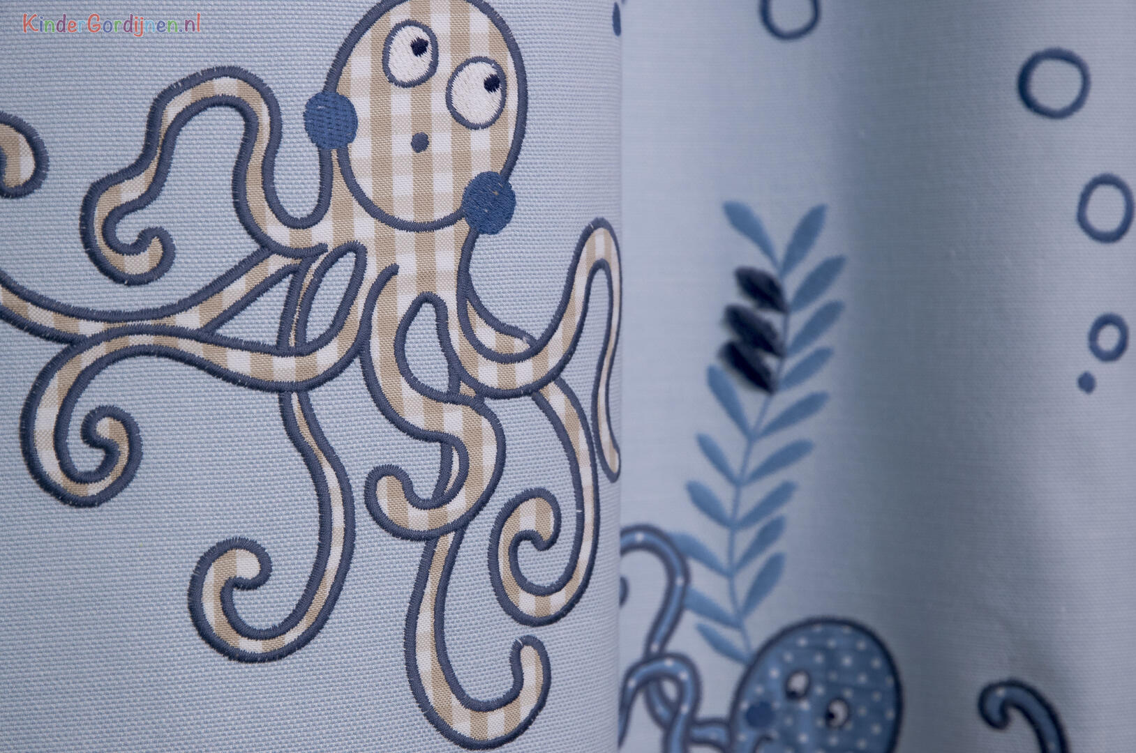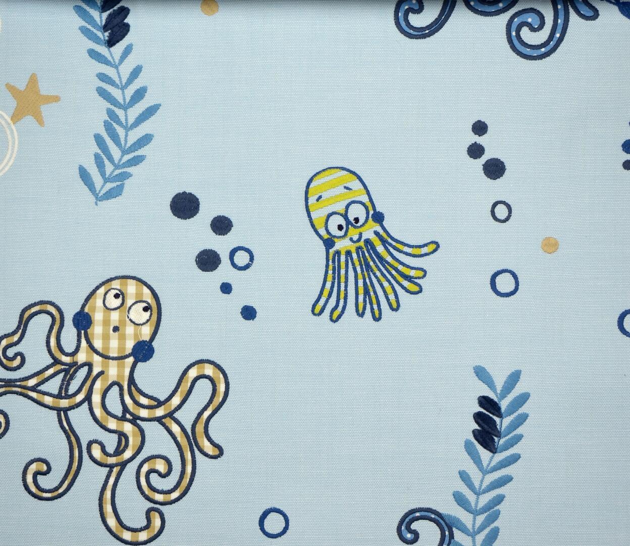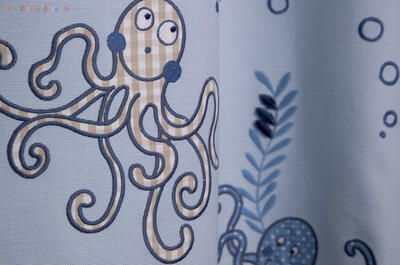 Elke octopus is met dik garen geborduurd en deels opgebouwd uit ingenaaide stukjes patchworkstof. In de foto’s zie je hoe sommige tentakels en koppen zijn ingevuld met ruitjes, streepjes en kleine printjes in blauwtinten, zandkleur, rood en wit. Die lapjes liggen iets hoger op de stof en geven het motief zichtbaar reliëf. Rondom de vormen lopen borduursteken die de dieren een getekende, bijna handgeschetste uitstraling geven. De octopussen hebben een formaat dat je meteen herkent op het gordijn en ze zijn verspreid over het vlak alsof ze rustig door het doek bewegen, afgewisseld met kleine nautische details die het geheel luchtig houden.