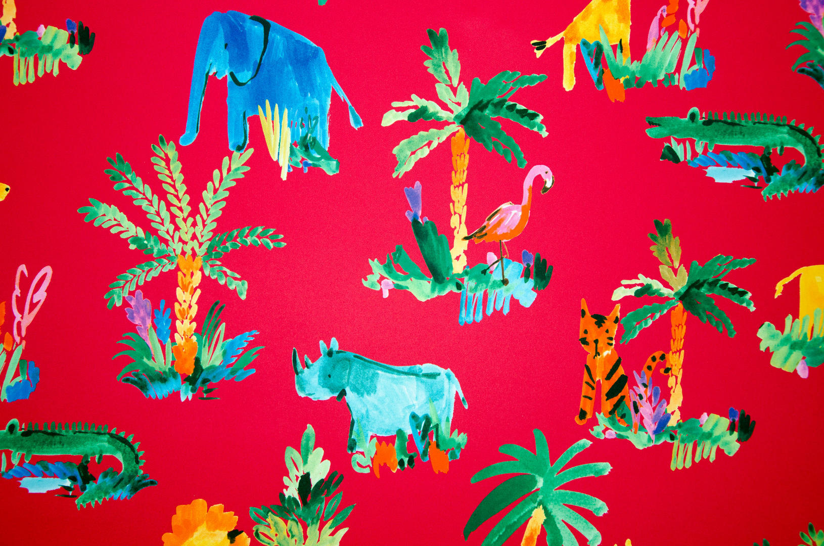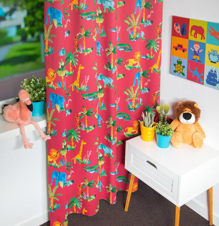 Een verduisterend TOPPERTJE, dat is dit kindergordijn! Vrolijke dieren zijn afgebeeld op bijna 100% lichtdichte stof. De safari dieren zijn met een vlotte penseel techniek als het ware geschilderd op de gordijnstof. Dat geeft een speels effect. De flamingo is 8 cm groot, de palmboom zo’n 18 cm. De achterzijde van de stof is egaal gebroken wit. Zie jij dit kindergordijn al voor je? Er is zoveel leuks op te zien en voering is niet nodig!