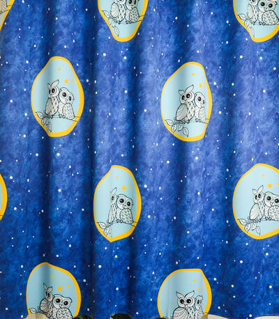 Dit is een ideaal gordijn: een leuke print die direct de kamer behoorlijk donker maakt. Dim out heet dat. Daardoor géén voeringkosten! Leverbaar in 2 kleurcombinaties, blauw met een wit motief en blauw met zachtblauw. De cirkel is 26 cm in doorsnede. Door dit royale patroon blijft de uilenprint rustig en kan het gordijn uitstekend tot de grond gemaakt worden. De witte spikkels lijken haast sterren aan de hemel te worden, zie jij dat ook?
