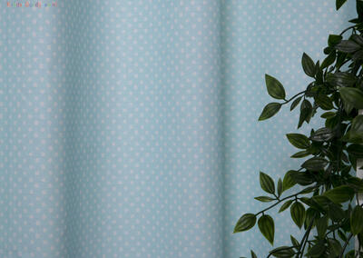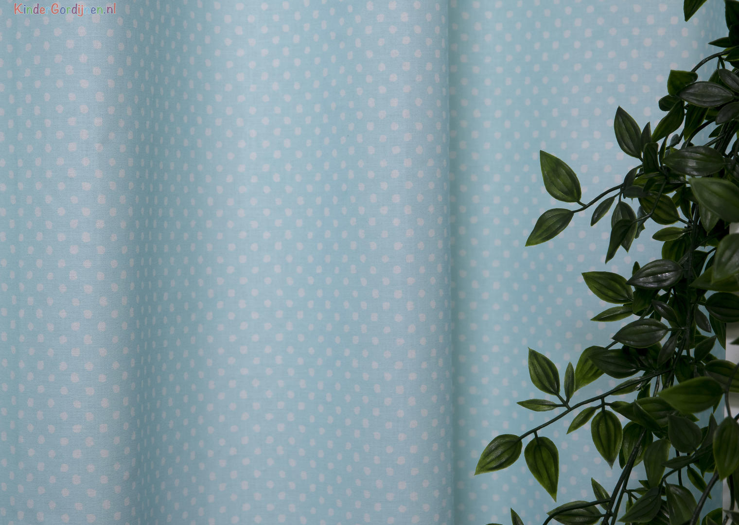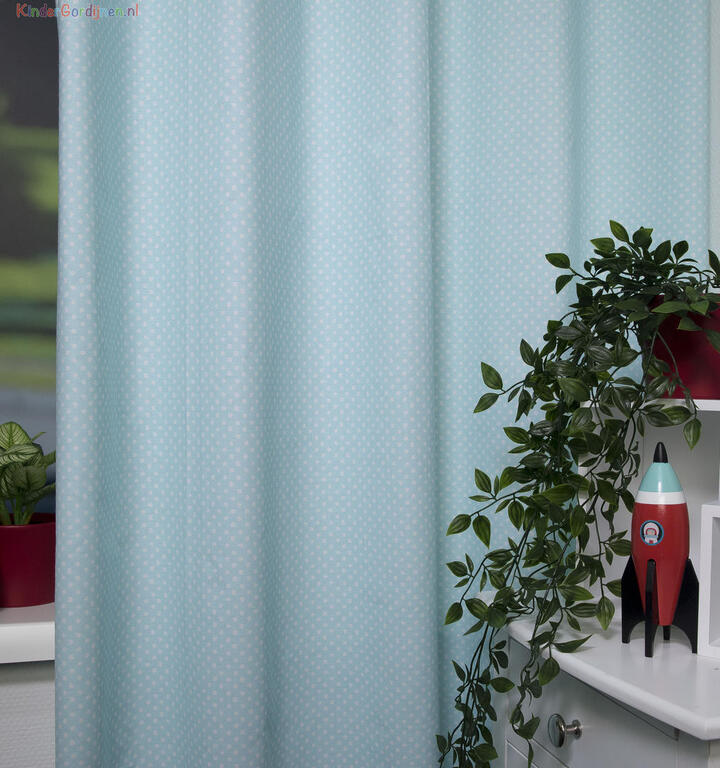 Populair kindergordijn met een eenvoudig stippenmotief tegen een roze of blauwe achtergrond. De stip heeft een doorsnede van 5mm. De katoenen gordijnstof voelt heerlijk zacht aan en kan door KinderGordijnen.nl gevoerd worden tot verduisterend gordijn.