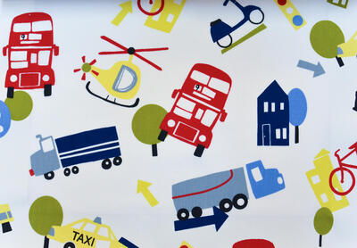 Het gordijn Traffic brengt een vrolijke verkeerswereld tot leven. Het patroon bestaat uit allerlei herkenbare voertuigen zoals vrachtwagens, taxi’s, dubbeldekkers en helikopters. Tussen de voertuigen zie je pijlen, verkeerslichten, bomen en kleine huizen. Alles is losjes over de stof verdeeld, waardoor het lijkt alsof het verkeer in alle richtingen rijdt. Dit maakt het gordijn levendig en leuk om naar te kijken, perfect voor een kinderkamer of speelruimte.