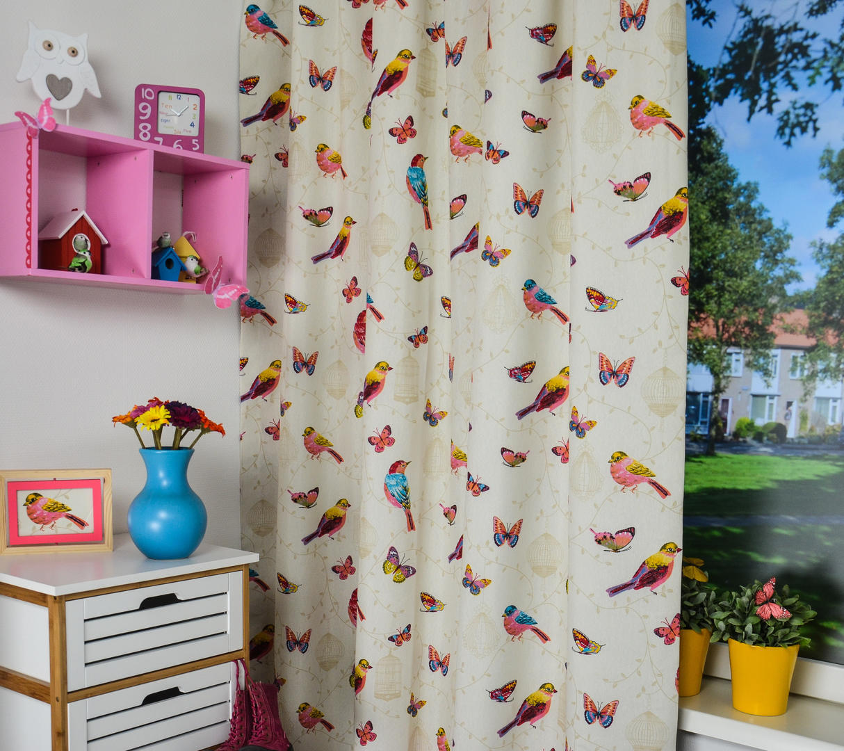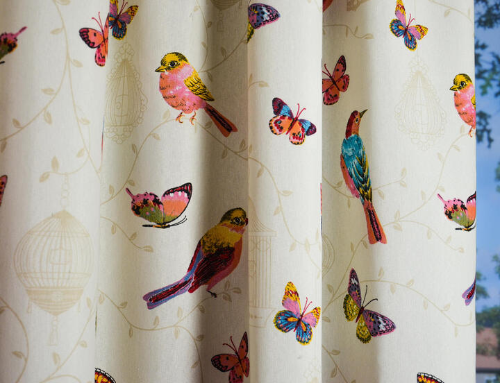 De naam van dit gordijn zegt het al: Pajaros betekent in het Spaans ‘vogels’. Vrolijke vogels zijn afgebeeld op matte, ecru kleurige stof. Ook zomerse vlinders vliegen vrolijk rond. De vogels zijn 15 cm groot en de vlinders 8 cm. Op de ondergrond zijn subtiel in zandkleur vogelkooitjes gedrukt. Doordat de stof niet al te zwaar geweven is, is het patroon aan de achterzijde ook aardig zichtbaar. Wil je graag donker slapen, dan kun je dit gordijn prima laten voeren. De stof is kamerhoog, waardoor je het voor dezelfde prijs kamerhoog kunt laten maken. Kies jij voor deze zomerse natuur sfeer?