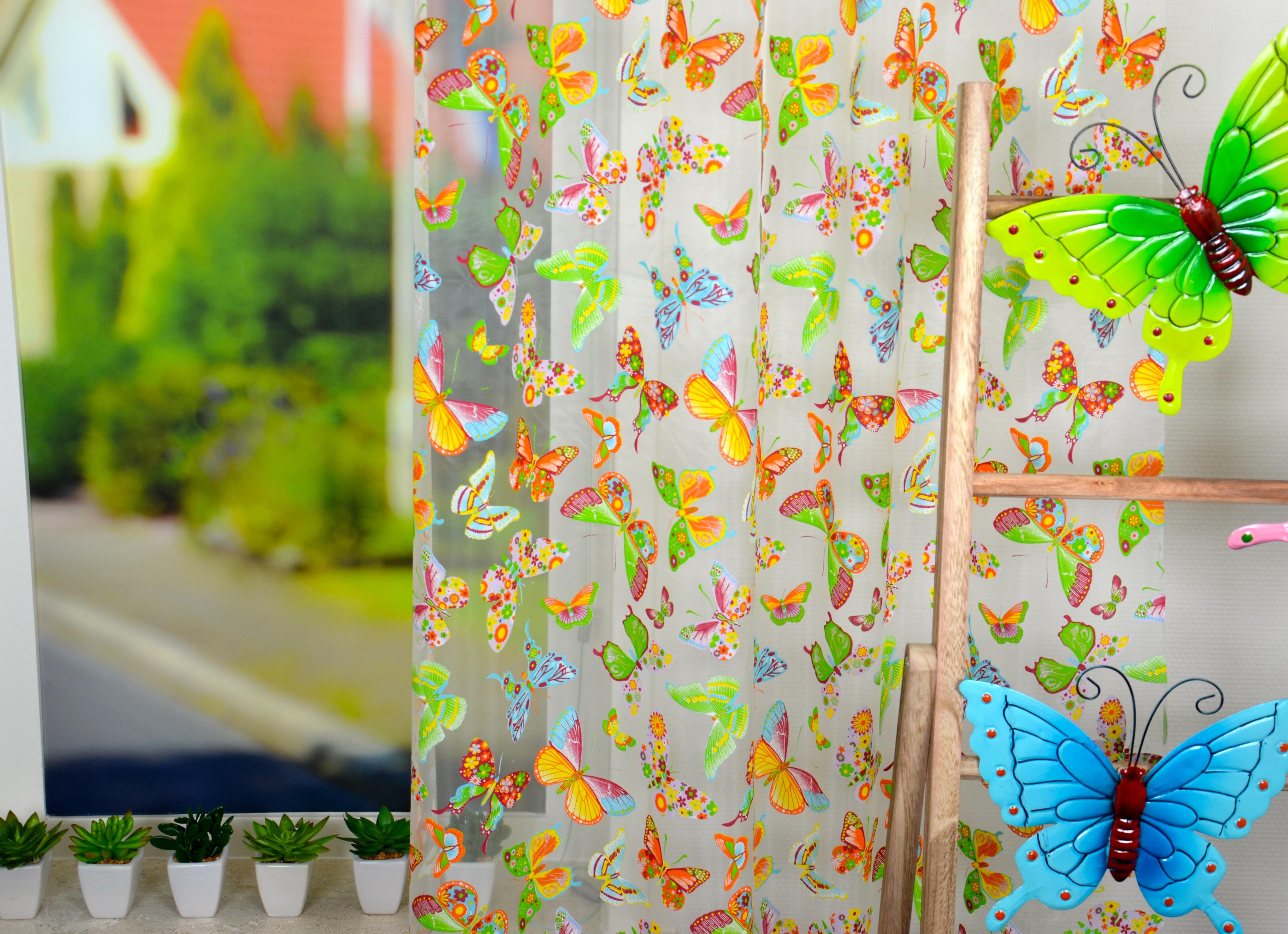 Haal de natuur in huis met deze luchtige, vrolijke voile. De vlinders lijken haast je kamer binnen te vliegen met hun kleurrijke vleugels. Welke hippe meid wil dat nou niet? De stof is transparant en kamerhoog, waardoor je ook echt geen naden ziet.