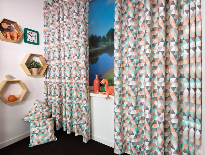 It’s in the name: pastelkleurige driehoekjes! Dit gordijn heeft duidelijk een grafisch patroon, wat zijn oorsprong vindt in Scandinavisch Design. Hier is gekozen voor zachtblauw, warmgrijs en poederig roze, gedrukt op een dichte weefstof met een matte textuur. Deze zachte kleurtonen geven een subtiel kleurrijk effect aan dit gordijn. De (slaap)kamer kan je voor de rest rustig houden met wittinten en natuurlijke materialen. Een emaille lamp, porseleinen vaasjes en rotan & bamboe combineren super leuk. Dit gordijn is óók uitstekend geschikt voor de hippe (jong) volwassene, het is zo fijn te combineren!