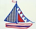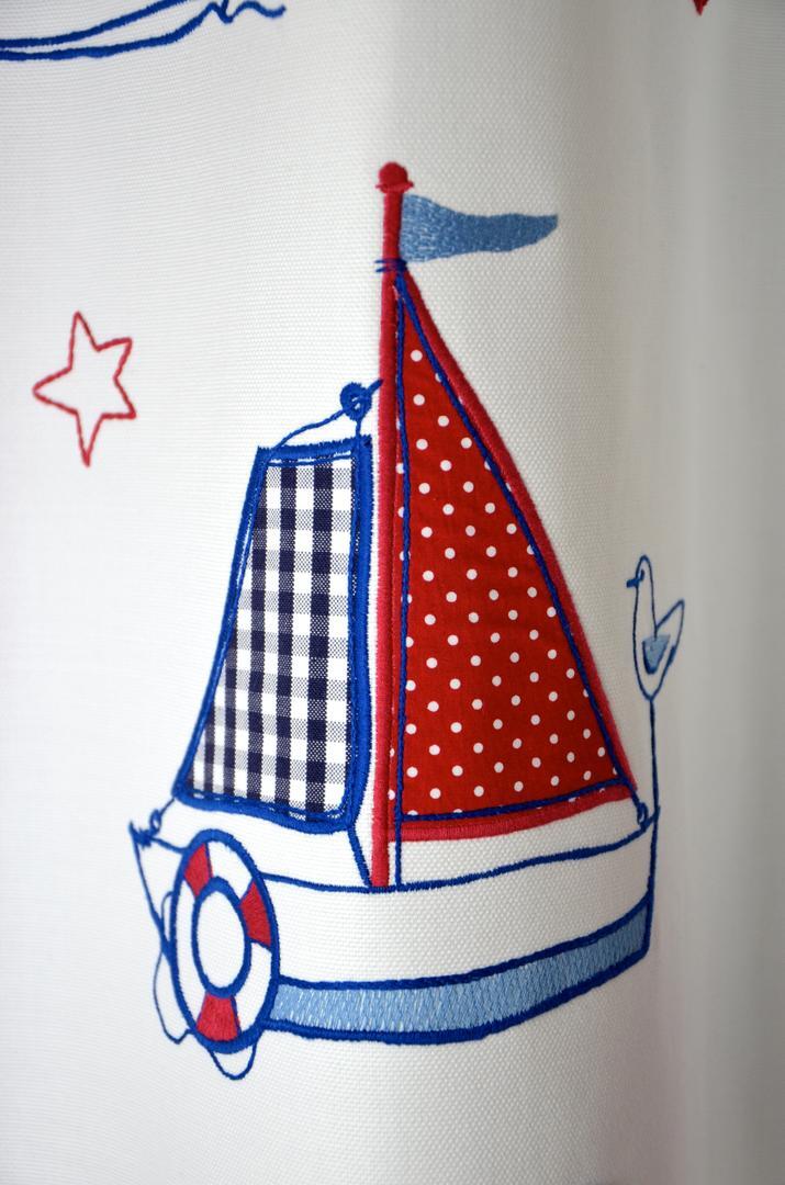 Het gordijn Happy Boy brengt een vrolijk maritiem thema in de kinderkamer met een patroon vol zeilboten, reddingsboeien, sterretjes en kleine vlaggetjes die speels over de stof zijn verdeeld. Op de foto’s zie je hoe elk bootje niet alleen is geborduurd, maar ook is opgebouwd uit echte, ingenaaide printstofjes: ruitjes, stippen en fijne weefsels vormen samen de zeilen, terwijl de rompen en details met een stevige borduursteek zijn omlijnd. Dat geeft een voelbare diepte en een ambachtelijke uitstraling die je direct ziet én voelt wanneer je de stof in handen hebt.
