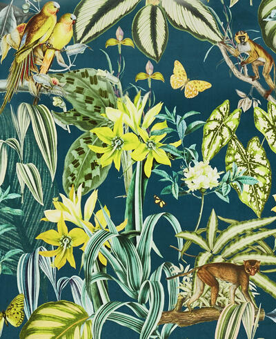 Hier 30 cm groot en de slingeraapjes, die mag je zelf opzoeken. De digitale print is op de voorzijde van de velourse stof gedrukt. Voor verduistering of extra kleurbehoud kan je het gordijn laten voeren. Welkom in het oerwoud, als je durft!