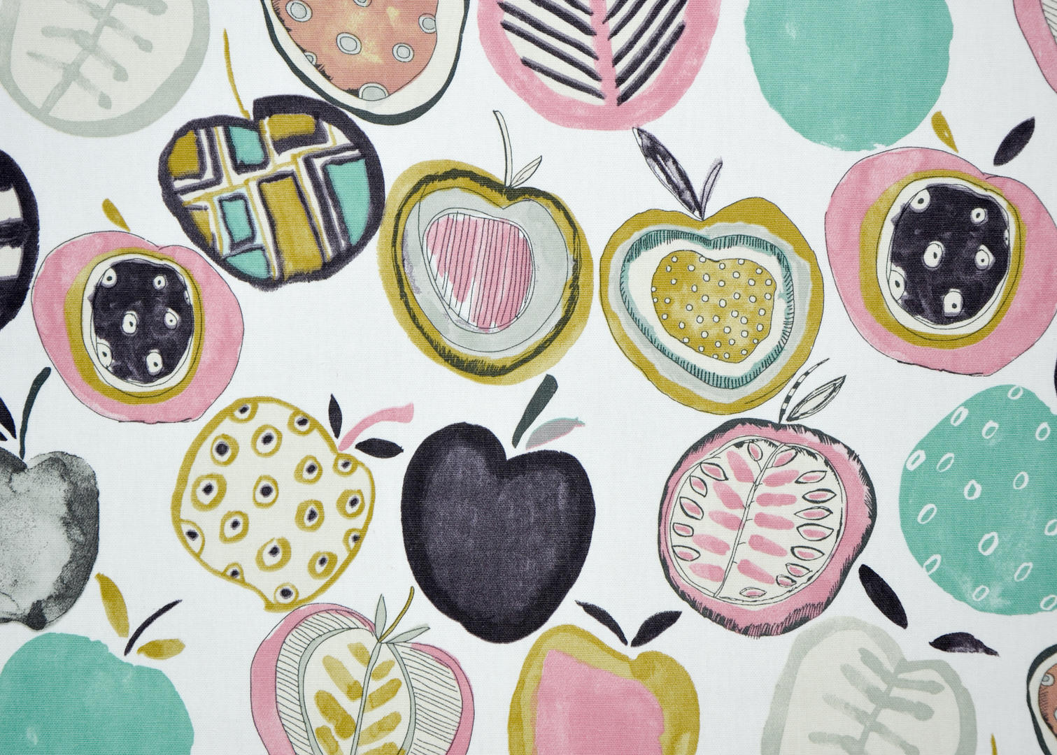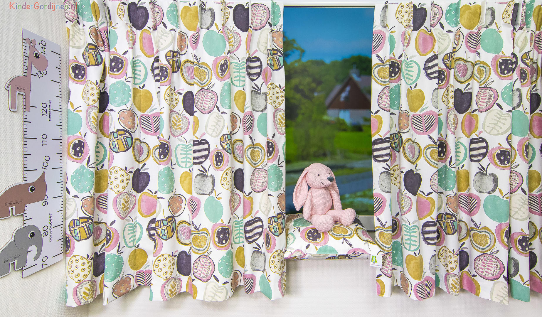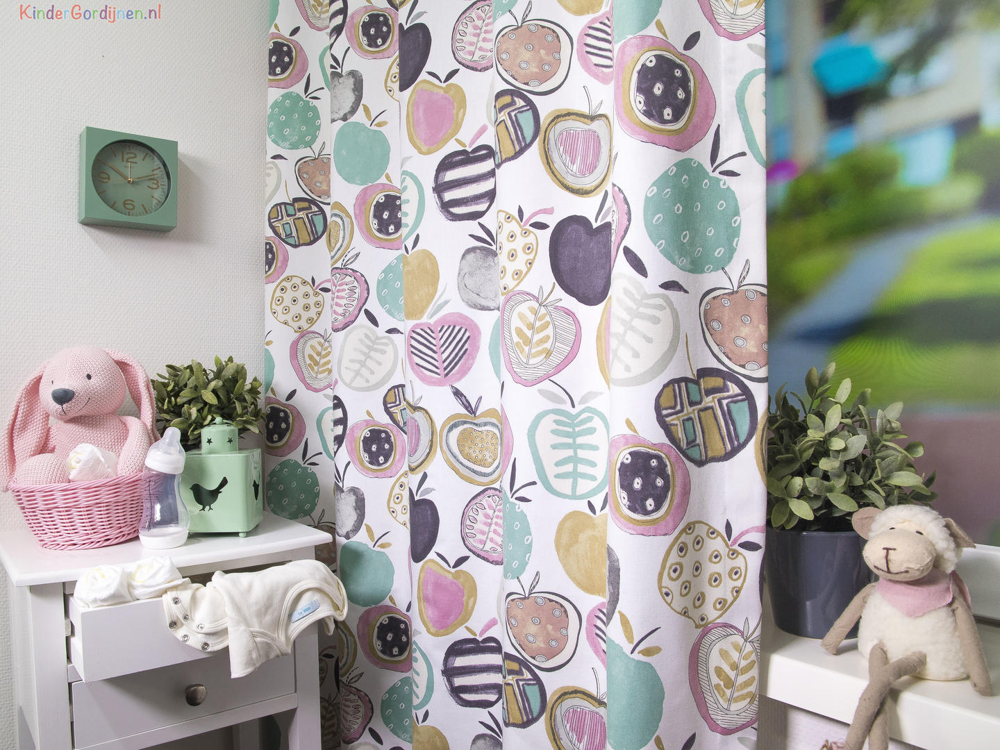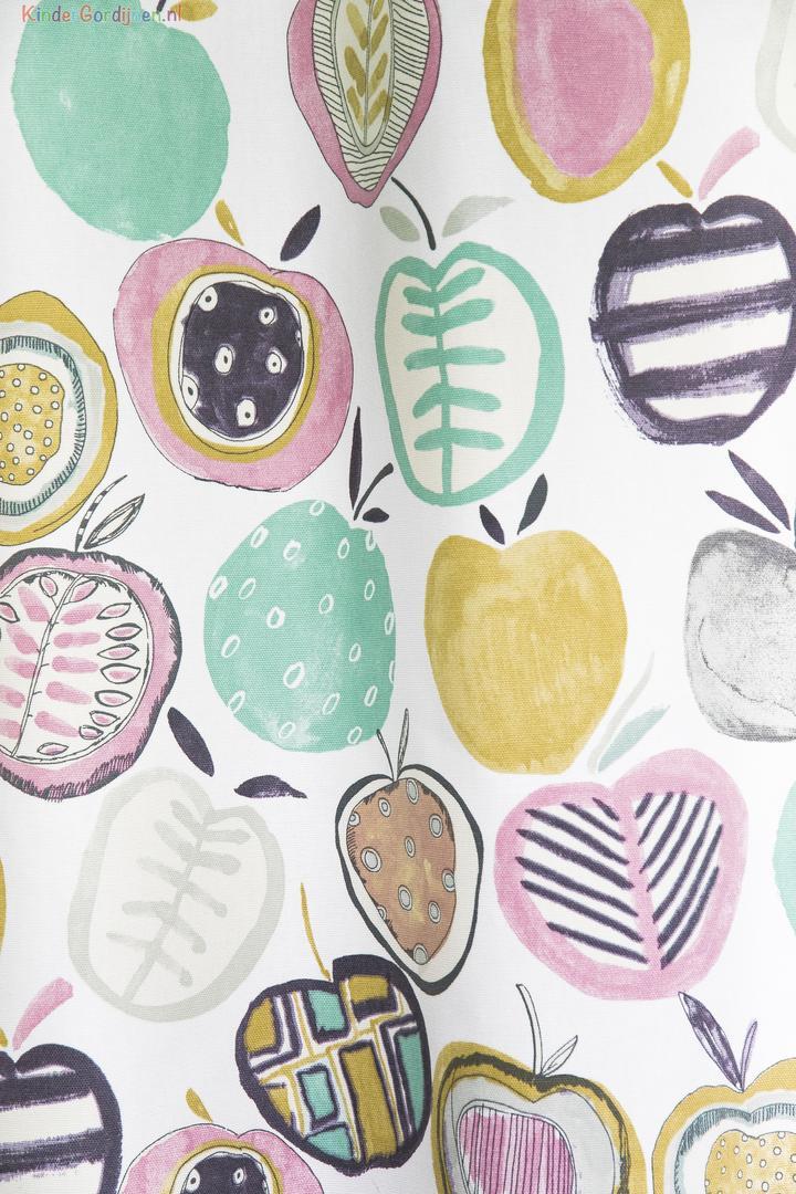 Een kindergordijn met appeltjesprint! De frisse kleuren ademen een warme sfeer in de kinderkamer. De appelprint is gedrukt op de voorzijde, ze zijn 10 cm in doorsnede. Het gordijn kan prima verduisterend worden geconfectioneerd, deze optie kunt u aan-vinken tijdens het bestelproces.