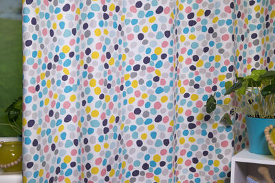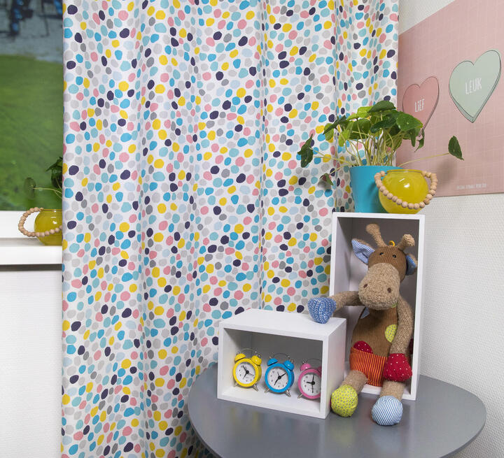 STIPPEN zijn HIP! En dit gordijn heeft er heel wat in héérlijke heldere, frisse kleuren. De stip is 3 cm in doorsnede en heeft het effect alsof zij met de kwast aangebracht zijn. Dat geeft een speels en kleurrijk effect. De ondergrond is een warm witte, dicht geweven stof, die desgewenst verduisterend gevoerd kan worden. Je kunt dit gordijn heel leuk combineren met een pittige muurverfkleur.