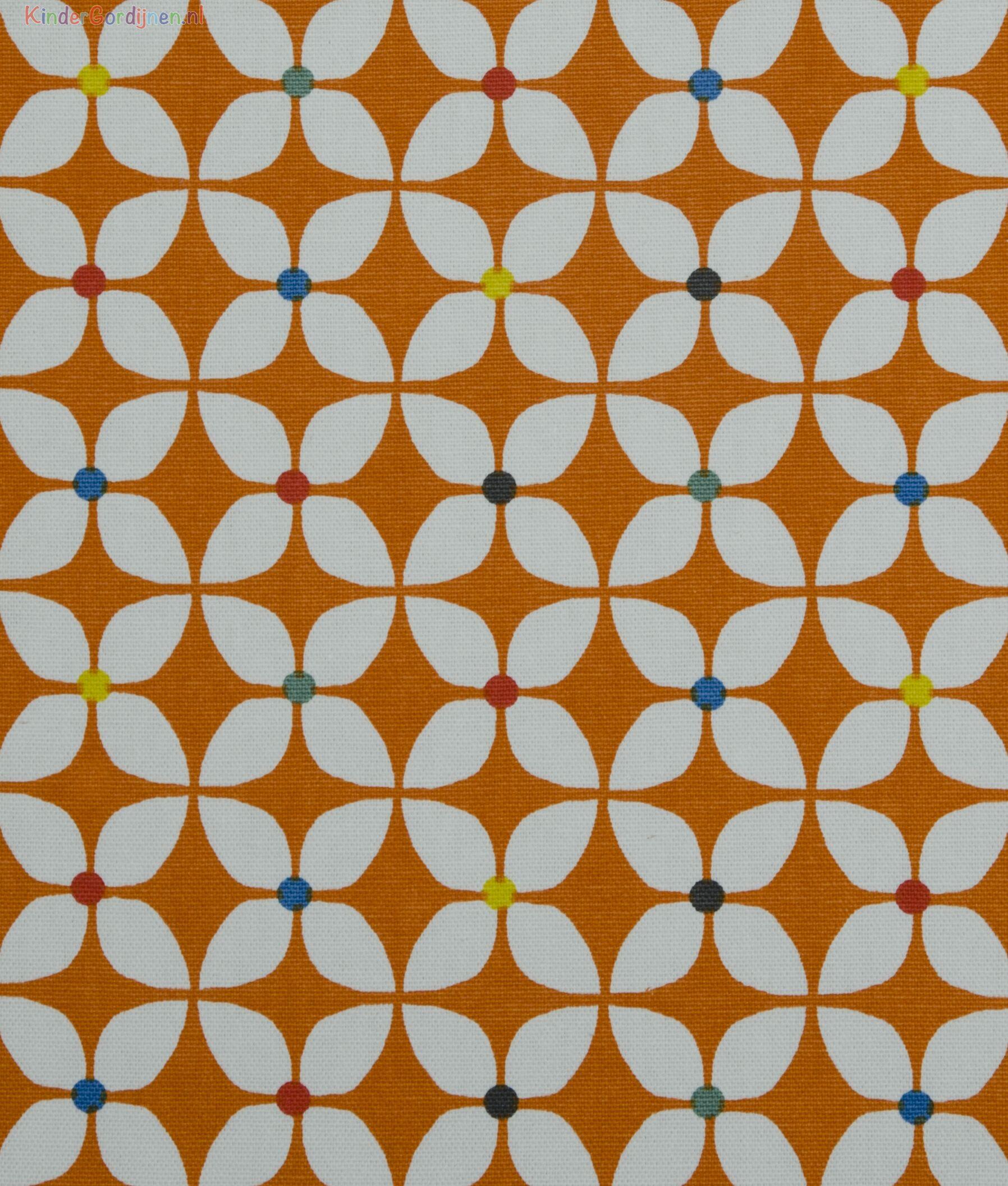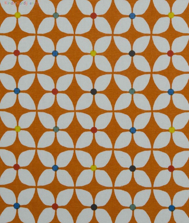 de gordijnstof Zapp, een kwalitatief hoogwaardig product met een tijdloos Scandinavisch dessin. Op de prachtige stof zijn kleine grafische bloemen afgebeeld, met witte blaadjes met kroontjes in bijpassende kleuren. Door het ritmische patroon dat zich herhaalt, krijgt het geheel een moderne en speelse uitstraling.