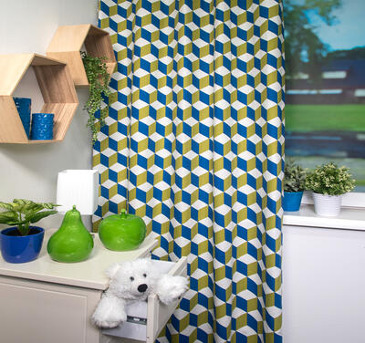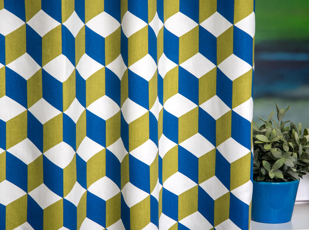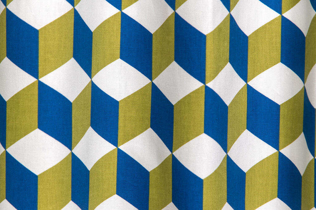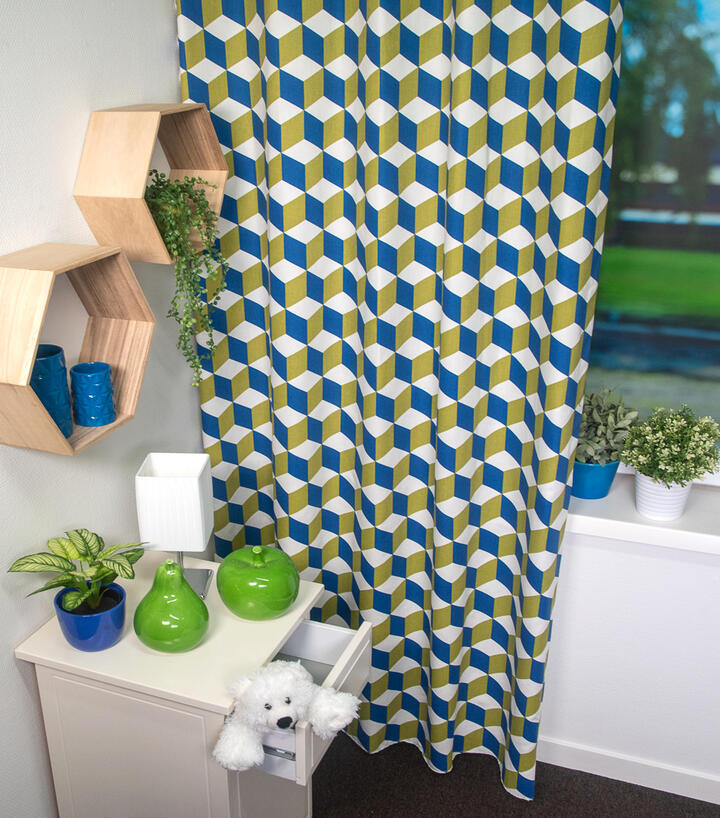 Cube Kindergordijn, dat is de naam van dit mooie gordijn. Het is een kindergordijn met allemaal vierkantjes (cubes) en het lijkt in de eeuwigheid door te gaan. Door de mooie kleuren van oranje en blauw en het rustige wit komt het kindergordijn helemaal tot leven. Het kindergordijn is gemaakt van 100% katoen hierdoor is het heerlijk soepel en zacht en kan je ook dit kindergordijn laten verduisteren zodat je in één keer klaar bent met het gordijn. Je kind kan nu heerlijk slapen in een donkere kamer. Maar als je het kindergordijn eerst wil zien en voelen dan bestel je een knipstaal en dan kun je het met eigen ogen zien. Dit is een tip van Jelmer! Hou jij ook zo van die wiskundige figuren?