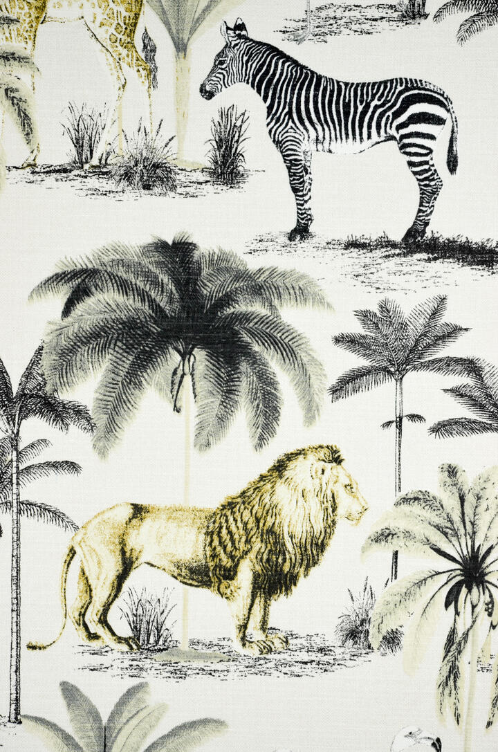 Kunstzinnig gordijn, met gebruik van exotische dieren. Deze dieren spreken bij kinderen altijd tot de verbeelding. Het fijnzinnige getekende patroon is gedrukt op fraai dichtgeweven, matte stof. Haast linnenlook in kleur én structuur. De wijze van kunstzinnig vormgeven is terug te brengen naar schilderkunst uit de Gouden eeuw. De stijlontwikkeling in die tijd neigde meer naar het realisme; interieurs, landschappen, stillevens en noem maar op. De leeuw hier is 20 x 14 cm groot en de stof leverbaar in 5 verschillende kleur combinaties. Wil jij een kamer met stijlvolle klasse, dan is dit jouw gordijn!