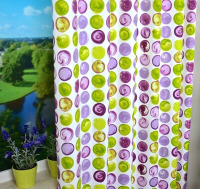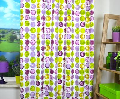 Vrolijke verfstippen op een warm witte ondergrond. Is het abstracte kunst of juist het schilderspalet? Beide stralen zonneschijn en creativiteit uit. De cirkels zijn 6 cm in doorsnede en het gordijn is leverbaar in 4 heldere kleurcombinaties. De stof is dicht geweven, voor verduistering evt. extra laten voeren. Alle kleurcombinaties zijn sprankelend en nodigen uit tot expressie.