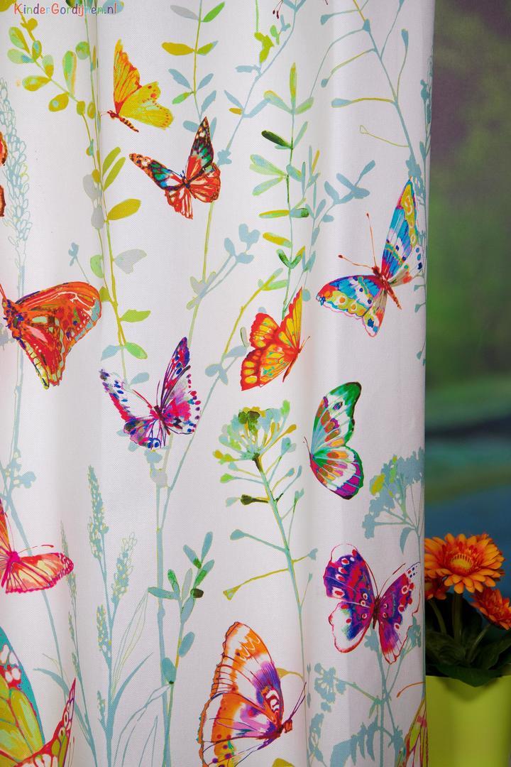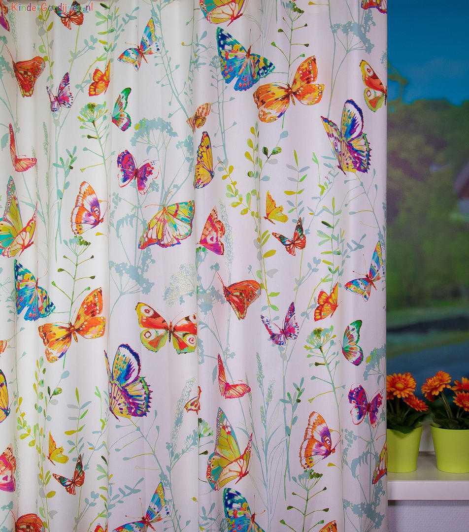 Maak kennis met het adembenemende overgordijn Miral! Dit gordijn is niet alleen functioneel, het is ook een kunstwerk dat iedere kamer transformeert. De dikke gordijnstof is digitaal bedrukt met levendige afbeeldingen van vlinders in allerlei kleuren die vrolijk fladderen tussen weelderige weidebloemen.
