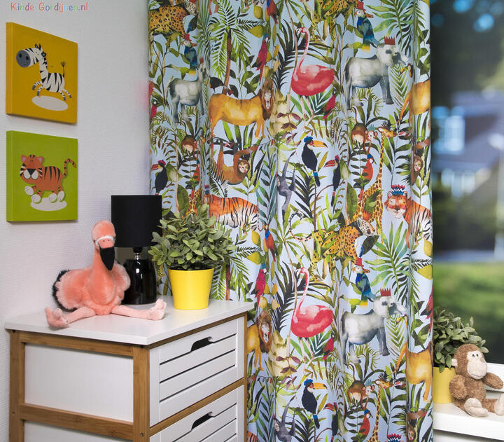 Een plaatje dit kindergordijn! De kleuropbouw is heel eigentijds, maar kijk eens goed naar de fraaie schilderachtige afbeeldingen. Het sfeertje ademt een stukje fijne nostalgie. De stof is dicht geweven en mat en aan de voorzijde bedrukt met deze aquarelachtig geschilderde safaridieren. Door het fraaie groene gebladerte op de achtergrond ontstaat zelfs de natural living sfeer. Palm, zeegras en riet & rotan passen hier perfect bij! Het oerwoud gordijn is leverbaar in 2 verschillende ondergrondkleuren: warmwit en fris aqua blauw. Goed te combineren met lichte wanden, maar ook een zachte, afgezwakte tint uit het gordijn maakt het geheel perfect in stijl!