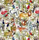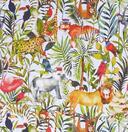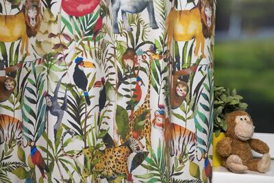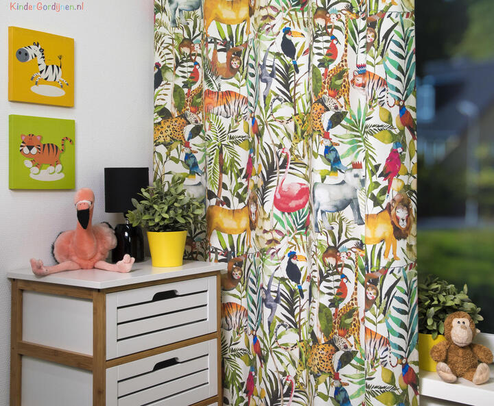 Een plaatje dit kindergordijn! De kleuropbouw is heel eigentijds, maar kijk eens goed naar de fraaie schilderachtige afbeeldingen. Het sfeertje ademt een stukje fijne nostalgie. De stof is dicht geweven en mat en aan de voorzijde bedrukt met deze aquarelachtig geschilderde safaridieren. Door het fraaie groene gebladerte op de achtergrond ontstaat zelfs de natural living sfeer. Palm, zeegras en riet & rotan passen hier perfect bij! Het oerwoud gordijn is leverbaar in 2 verschillende ondergrondkleuren: warmwit en fris aqua blauw. Goed te combineren met lichte wanden, maar ook een zachte, afgezwakte tint uit het gordijn maakt het geheel perfect in stijl!