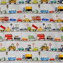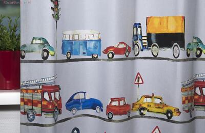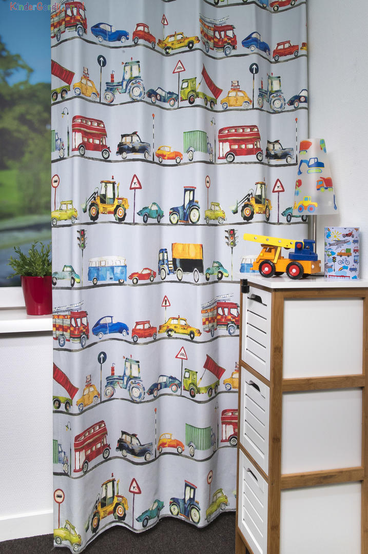 Een file was nog nooit zo leuk! Dit kindergordijn met auto’s, tractoren en vrachtwagens in vrolijke kleuren, maakt van iedere jongenskamer een gezellige plek. De grote verticale banen van ongeveer 20 cm, zorgen ervoor dat de print niet te druk wordt. Door de grote variatie aan voertuigen verveelt dit gordijn nooit! Je kunt kiezen voor een stoere lichtgrijze/off-white achtergrond, of voor een neutrale witte achtergrond. De gordijnstof is van 100% katoen en kan indien gewenst verduisterend worden geleverd.