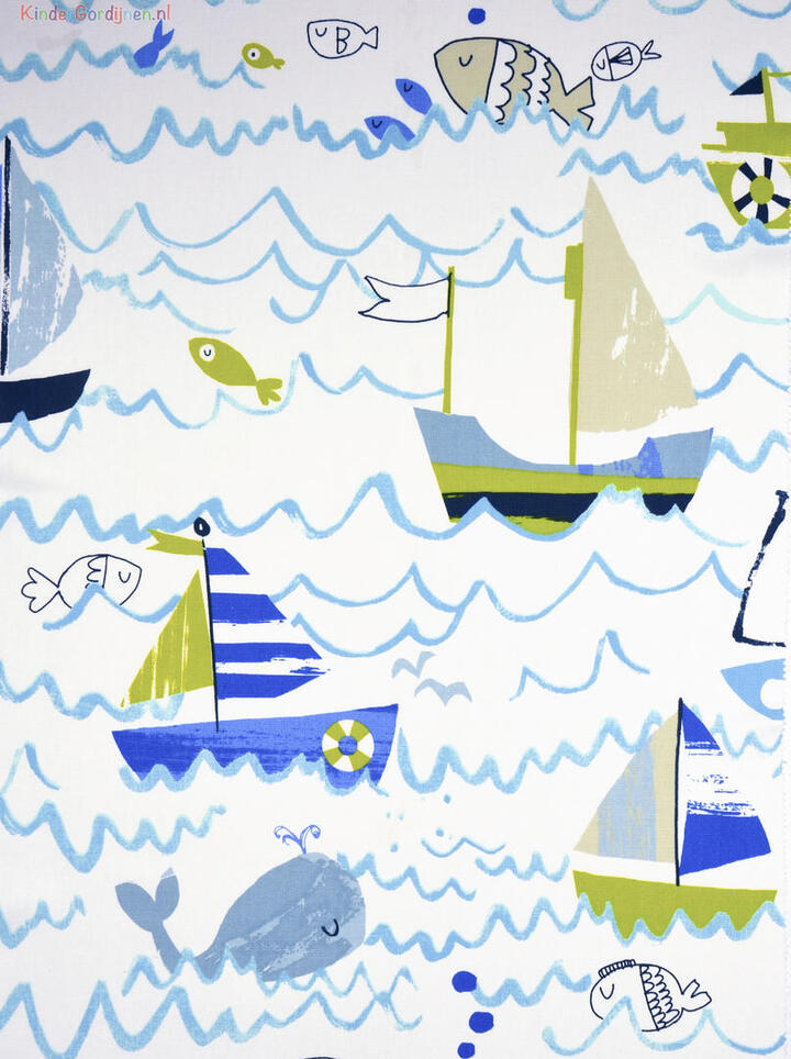 Een fraai maritiem gordijn, leverbaar in 2 kleuren. De lekker robuust geweven stof is warm wit van kleur en aan de voorzijde bedrukt met grafisch vormgegeven bootjes en visjes. De blauwe variant heeft diep steenrood als accentkleur. De aqua blauwe variant is lichter en fris van kleur en heeft lindegroen als accentkleur. De bootjes zijn +/- 15 cm groot. Het is natuurlijk super leuk om dit thema met accessoires uit te breiden en evt. een accent blauwe of groene wand. De kwalitatief hoogwaardige stof valt soepel en kan desgewenst nog gevoerd worden. Zie jij de nieuwe kamer al voor je?